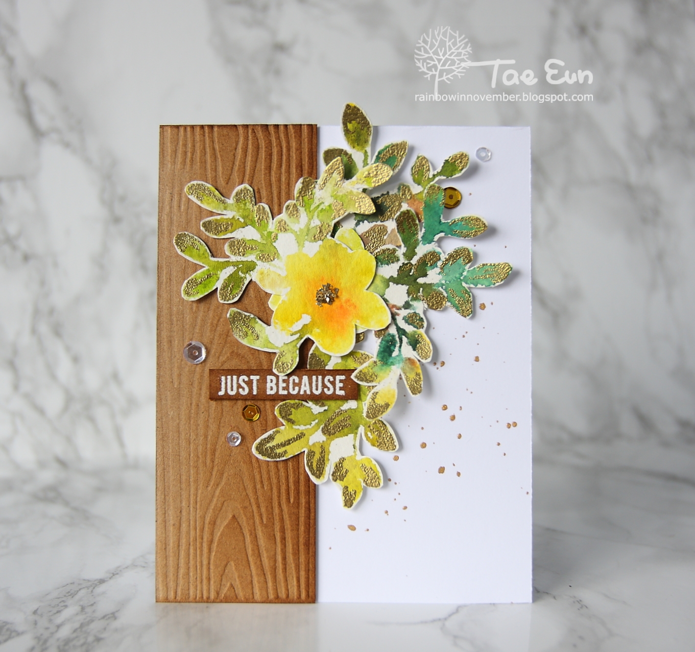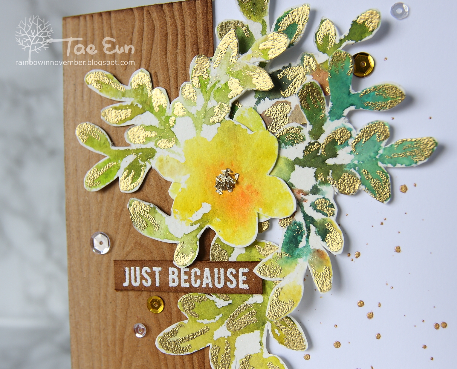 I started off by stamping the leaves and flowers from Floral Shadow stamp by Altenew using Aqua markers and spray of clear water. I used the fall colors of the color palette from the October Inspiration Challenge at Altenewblog. I fussy cut all the images and added some gold embossing after I drew in using an embossing pen. The wood grain panel was dry embossed on which I blended Vintage Photo DI. Before I assembled all the elements as shown in the picture, I splattered some gold ink on my card base. I took a sentiment from Bejeweled stamp set also from Altenew, white heat embossed it on the same dark brown cardstock like the woodgrain panel, cut and blended some Vintage Photo DI as well and foam mounted on the card.