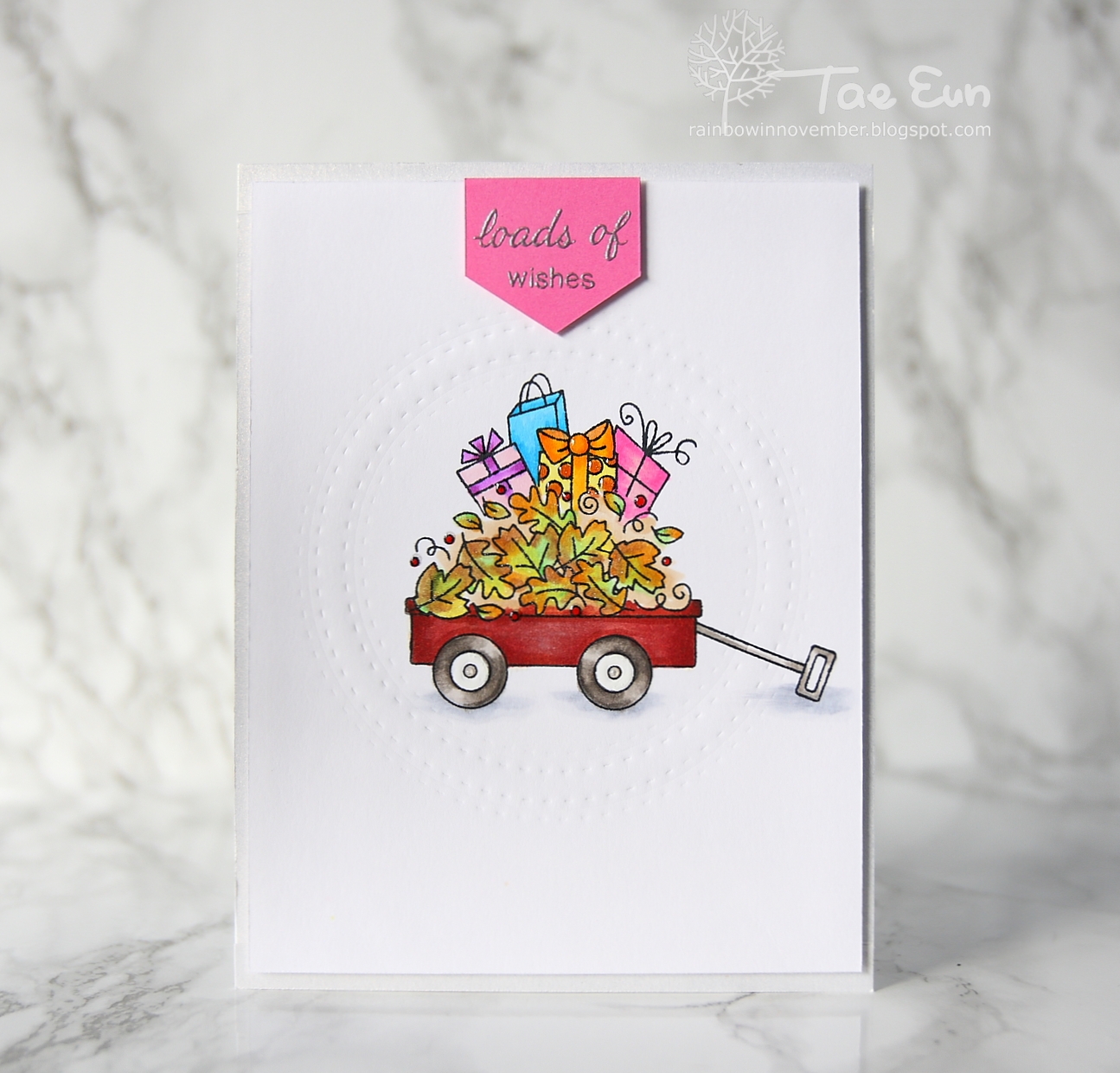 The stamps I used for this card are from the Wagon of Wishes stamp set by Newton’s Nook. At first I stamped the pile of leaves on the center of my front panel, masked it off and then stemped the presents and wagon in Memento black to color them with Copic markers. To frame the image I embossed two stitched circles using SSS dies. The front panel was trimmed down a bit and foam mounted on the card base on which I adhered some shimmery silver cardstock. The sentiment was silver heat embossed on some hot pink cardstock, cut and added on the card using some foam adhesive.
