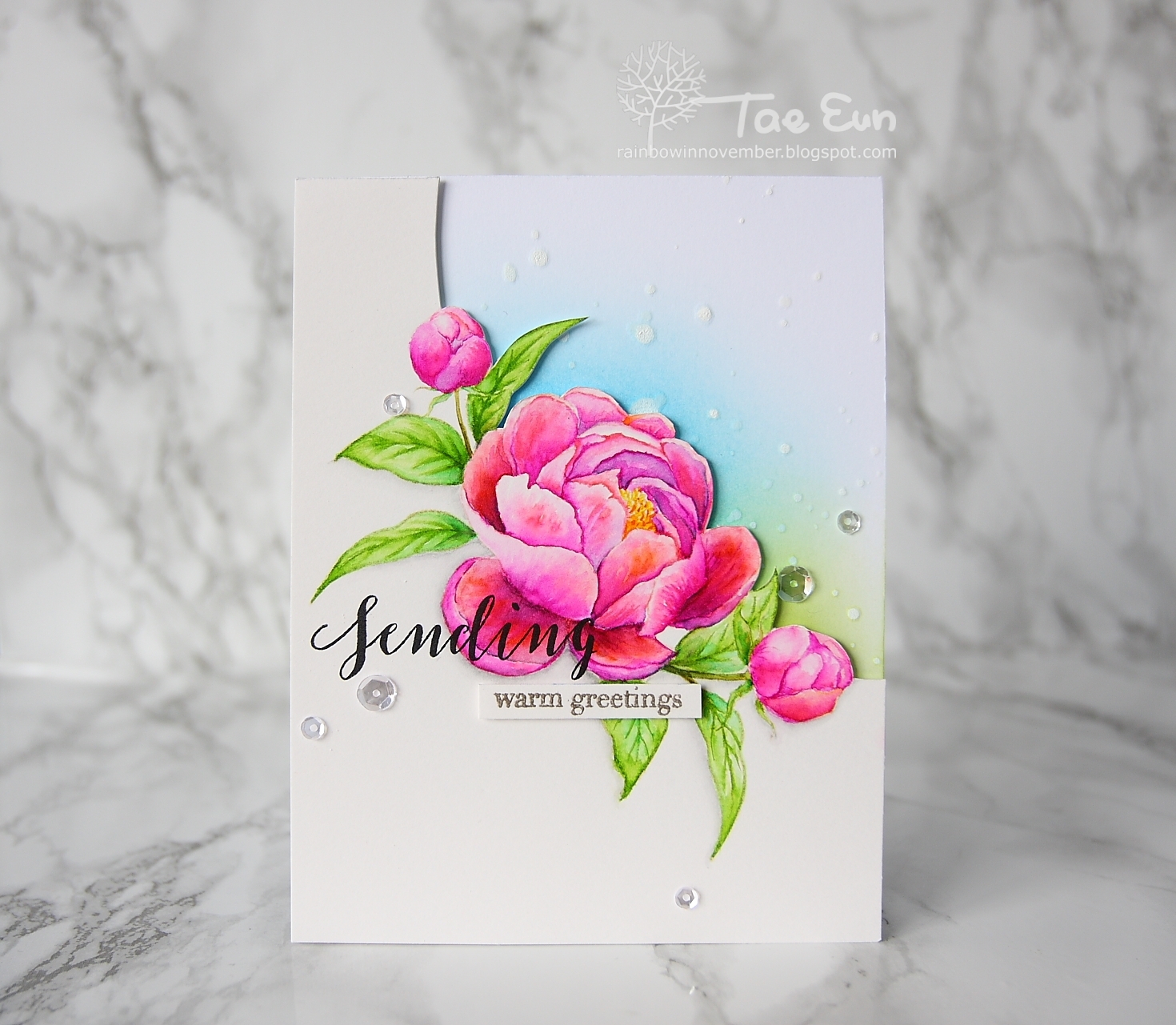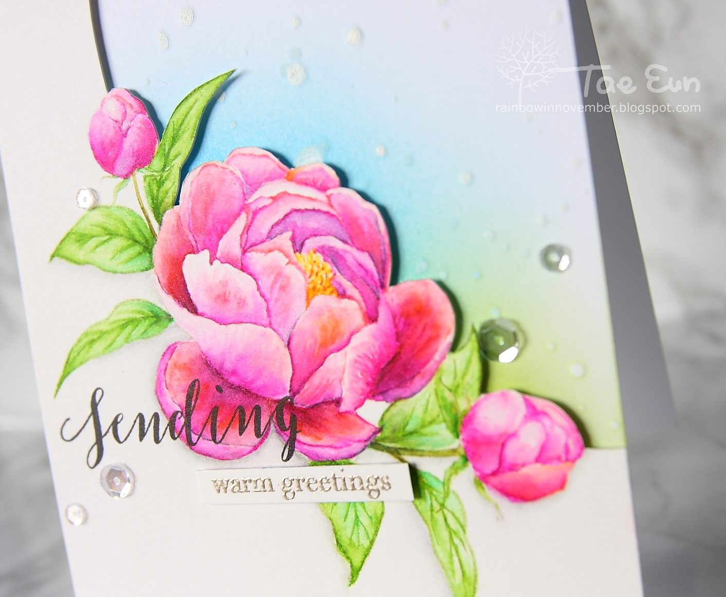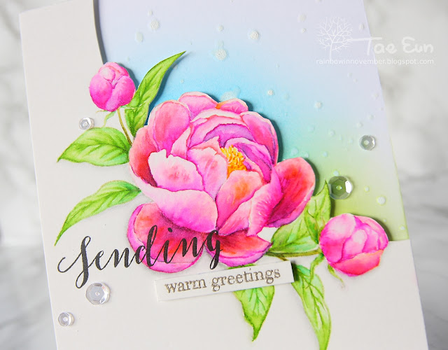 I stamped the peonies in Tattered Rose and the leaves in Antique Linen DI, masking the images wherever needed. The colors I used for peonies are Light Pink, Light Carmine, Orange, Fl.pink, Dark pink and Blue gray, colors for leaves are Pale gr, Light Gr, Green and Persian Gr. I added some light gray shade along the outline of the bottom part.