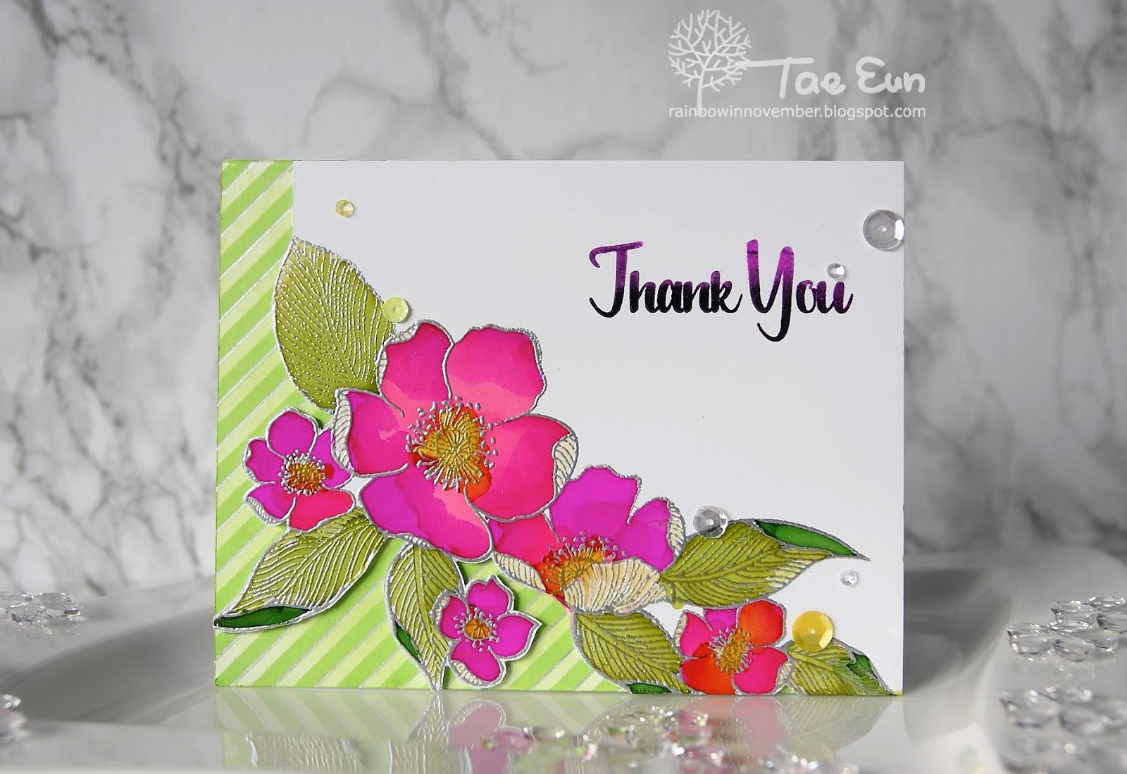 To start off I stamped and heat embossed the flowers and leaves from Adore You stamp set by Altenew in silver on a glossy cardstock, along with masking if needed. I then applied alcohol inks. I used for the flowers Raspberry, Flamingo snd Sunshine Yellow, and for the leaves Botanical and Citrus. While waiting for the panel to dry I prepared the card base by stamping the Diagonal Stripes from SSS in Soft Garden from The Ton and blended Twisted Citron DI on it. I added silver lines to the stripes for more interest. I then cut the alcohol ink panel along the left and bottom outlines of the flower cluster and mounted it on the card base using some foam tape. The sentiment is from the same stamp set as well. I stamped it in Wild Orchid first and then partially (bottom part) in black to achieve an ombre look. To finish off I added a few sequins.