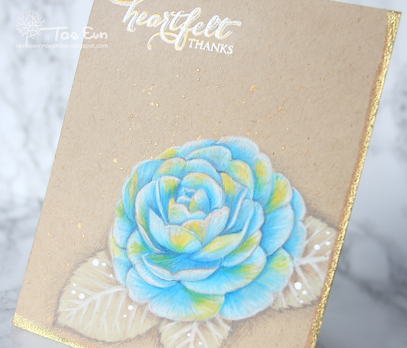 I sketched a camellia flower and leaves on kraft card stock and colored it with Prismacolor colored pencils. I then added golden lines on right and bottom edges and splattered some gold ink. But the edges were too dark and brown for me. So I decided to heat emboss the edges in gold.