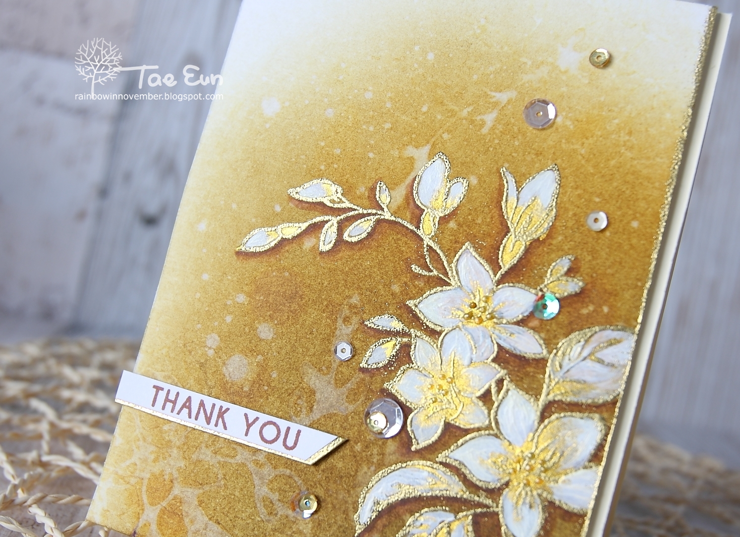 The sentiment is from Magnolias for Her. I stamped it on white cardstock in brown and added gold heat embossed strip of paper underneath. To finish off I added some gold dots using Pico embellisher as stamen and scattered a few sequins.