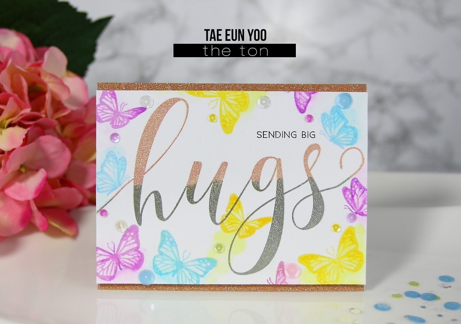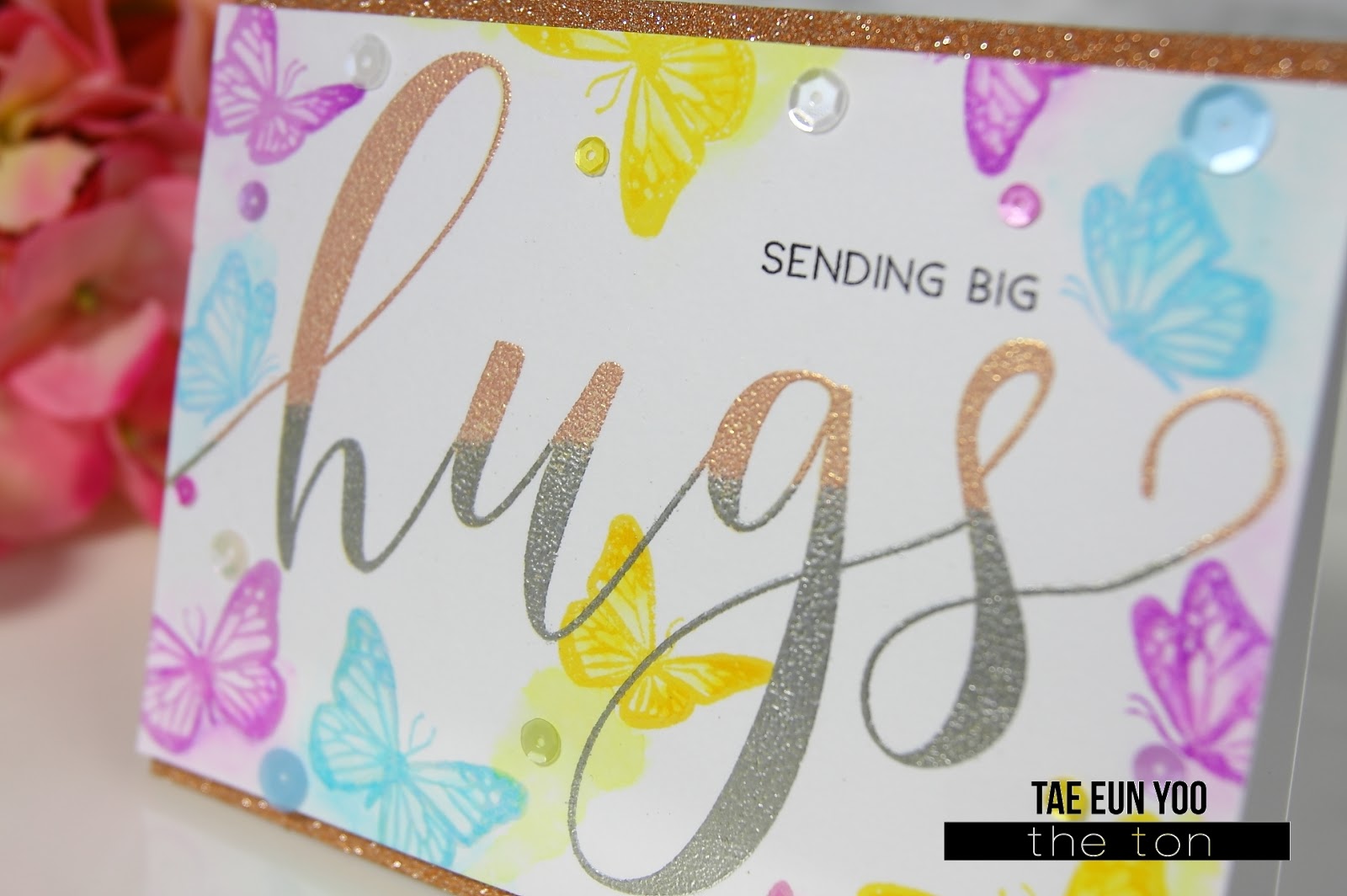 Today’s second card is featuring Brushed Hugs and the Beautiful Butterflies 1 (Monarch). I stamped the Brushed Hugs in embossing ink and heat embossed it the lower half in silver and the upper part in rose gold using our Rose Gold embossing powder on a watercolor paper. I then stamped the butterflies in Arctic Sky, Orchid Crush and Lemon drop and went with Zig brush pens in similar colors over the butterflies and added light wash to the trail of the butterflies. I added rose gold glitter tape from the thin Glitter tape sampler pack on the top and bottom of my card base and foam mounted my front panel on it. To finish off I scattered sequins from Princess Glam, Winter Thaw, Cotton Candy Puff and Flamenco Sunset Couture Mix.