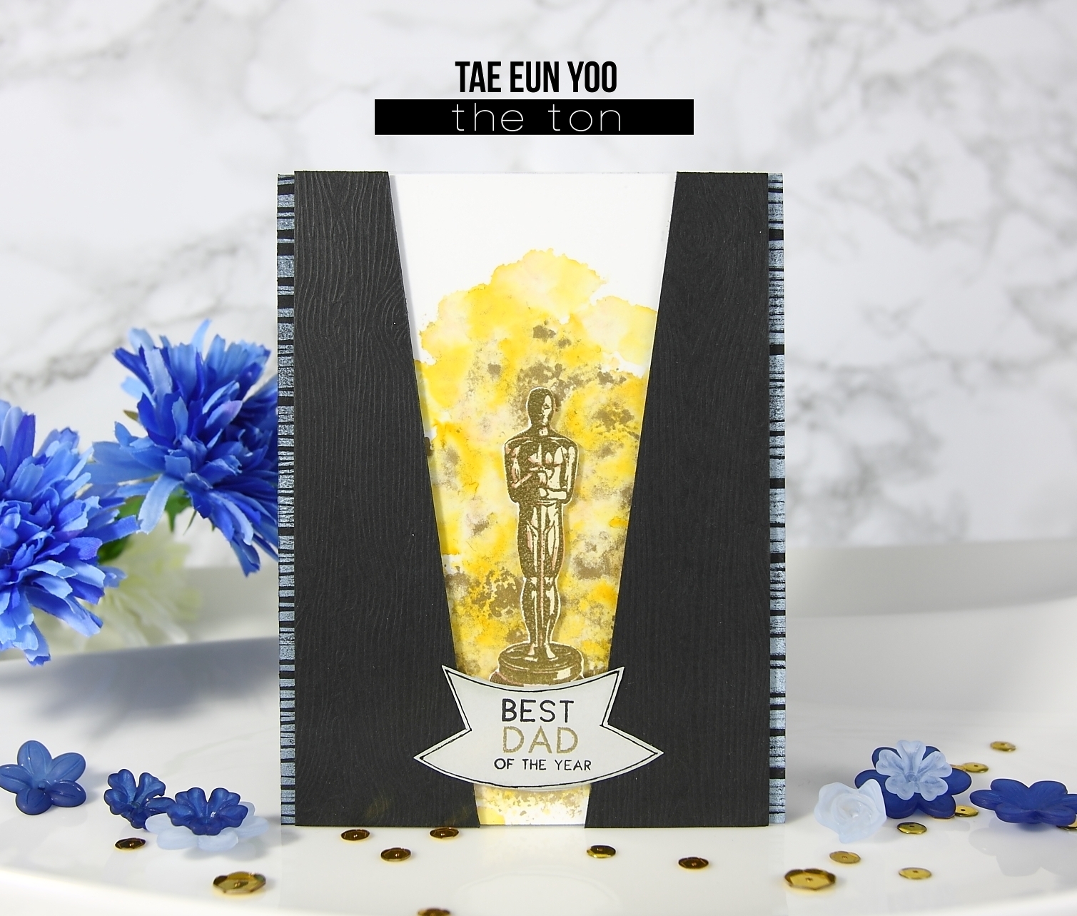 My first card will be a good one for Father’s day! I started out by stamping the oscar trophy from Oscar stamp set. I used Vanilla Frosted Cupcake, Warm Hazelnut and Found Topaz for layered stamping. I then stamped the second layer again in embossing ink and gold heat embossed it to make it into a golden trophy! For my background I took a Yupo paper and tapped a mix of yellow and gold alcohol ink on it using a felt applicator. I stamped the Freestyle Stripes stamp using Hampton white pigment ink on my black cad base and mounted the Yupo panel on that. I then cut some black cardstock with woodgrain texture in an angle in two pieces and glued an acetate sheet between them to create a display cabinet for the trophy. Next I stamped the BEST… OF THE YEAR from Oscar stamp set in Noir and gold heat embossed the DAD on a gray cardstock, cut it in a curved banner shape and adhered it on the acetate. I mounted the front panel with acetate using some foam adhesive onto the card.