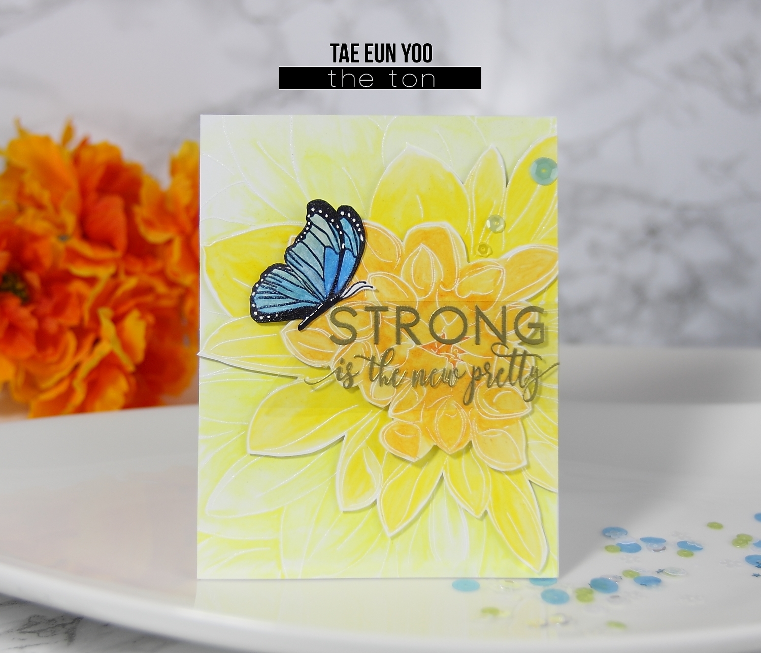 For a dimensional look I decided to create the dahlia in layers. So I white heat embossed the dahlia three times on Bristol paper and colored them in different shades of yellow using Zig brush pens. I blended the colors with a clear Glitter brush pen. I then cut the panels and foam mounted them in layers. The sentiment from The New Pretty stamp set was heat embossed in gold on a piece of clear acetate which I cut in a banner. I applied adhesive on the back of the heat embossed sentiment and added the acetate banner on the card. The big Morpho blue from Beautiful Butterflies 3 was stamped in Noir and clear heat embossed. I colored the butterfly using Zig brush pens and glitter markers in blue. I then added white dots on the wings and Glossy Accents on the body.  Three sequins from Winter Thaw and Flamenco Sunset  were my finishing touch.