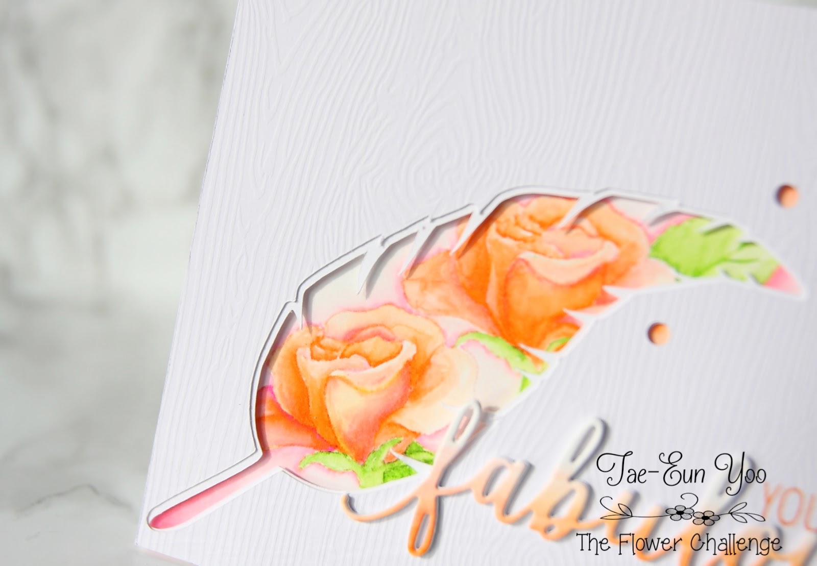 To start off I made a cutting file of a feather in two layers and cut them out from a white cardstock and a white woodgrain cardstock with my Cricut. I cut small circles too with which I replace the embellishments on Therese’s card. The roses are from Hero Arts. I stamped the rose twice using Tattered Rose and Twisted Citron DI on Bristol smooth paper and colored them with Zig brush pens. I used orange and pink shades for the roses and added pink for the background. The sentiment die is from The Ton. I die cut it from a snippet of paper which I colored with Zig brush pens in the same colors like the roses. The YOU ARE in orange is from Avery Elle.