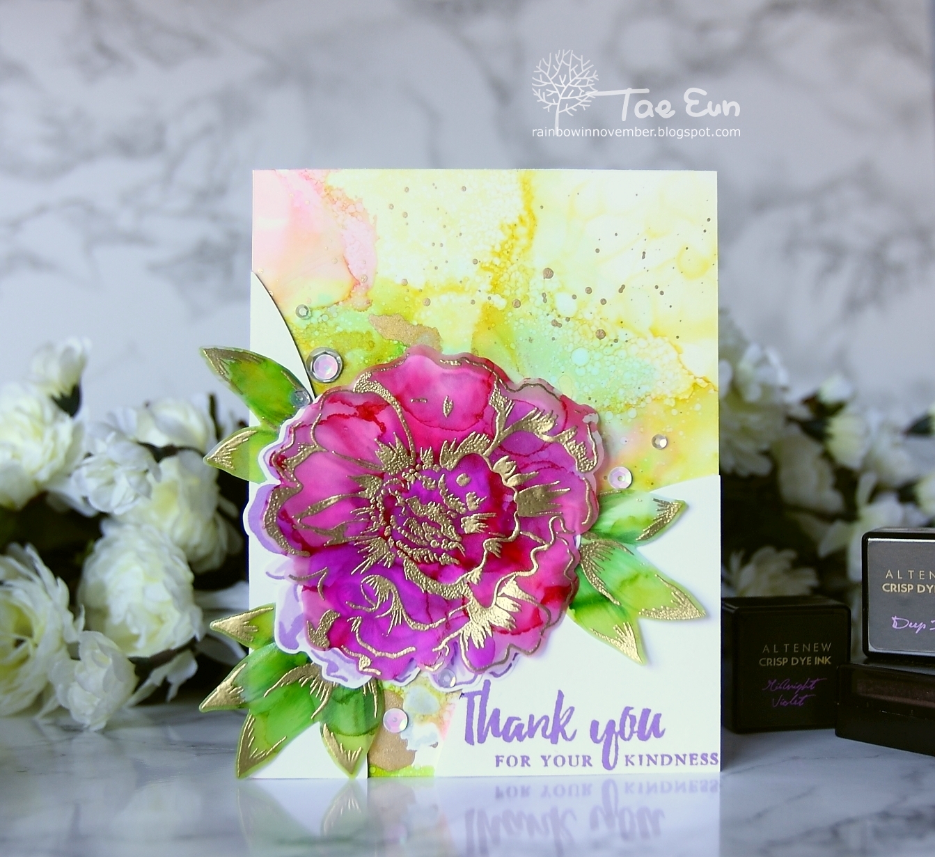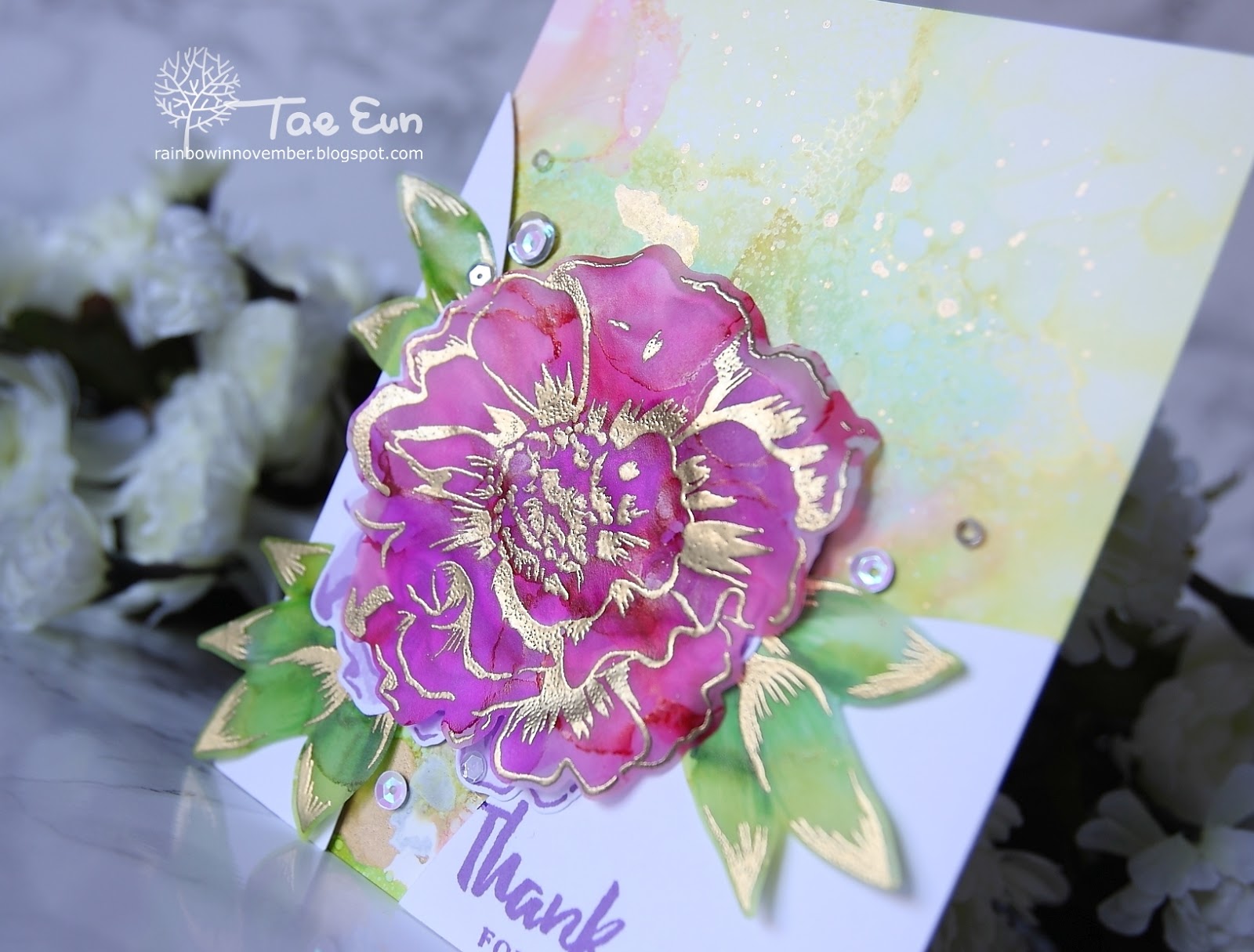 To make this vellum flower I colored a piece of vellum with pink alcohol inks (Raspberry, Flamingo and Shell Pink) and blending solution. I blew the colors to spread it after dripping the ink on the vellum. After the vellum was all dry, I stamped the third layer stamp from Build-A-Flower: Camellia set in embossing ink, heat embossed it in gold and cut it using the coordinating die. The leaves were created in the same way. I used Limeade and Botanical for the leaves. Set them aside, I created my background panel using alcohol inks and Yupo paper. I sprayed the Yupo paper with rubbing alcohol first then dripped the colors and spread them by blowing. I used Flamingo, Shell Pink, Limeade, Snow Cap and Gold mixative. As the background was too busy, I cut two partial panels in white with my Cricut. I stamped the sentiment in Deep Iris on one of the panel. I stamped one more camellia in purple shade using all the layers and die cut it. I glued the background panel flat on the card base, foam mounted the two partial panels and arranged the flowers and leaves as shown in the picture. Some sequins were the finishing touch.