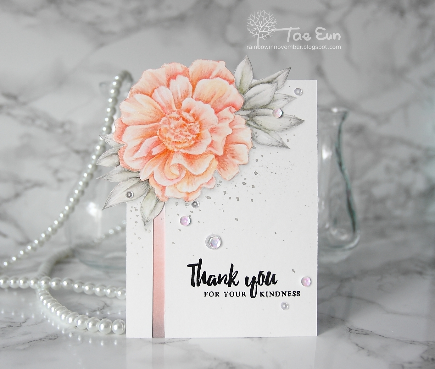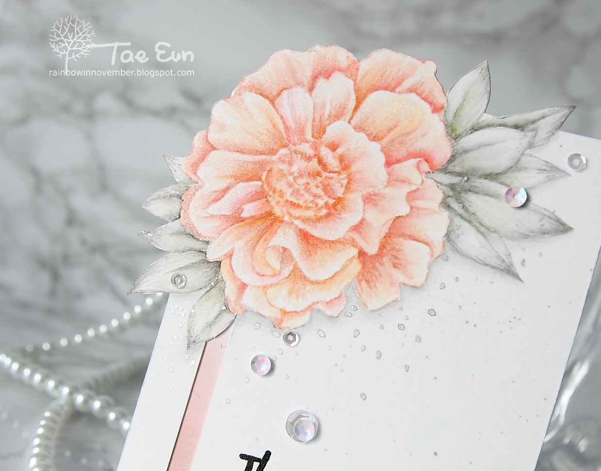 I wanted to make a off-the-edge image card. So I cut Canson water color paper larger than A2 size and stamped the camellia in Tattered Rose DI and the leaves in second generation of Hickory Smoke DI after masking the flower on the top left corner of my panel. I used for both the third layer stamp of the Build-A-Flower: Camellia set. I then colored the image using Zig brush markers and Koi water color. I tried to stay in coral and gray color combination but added a little bit of pink to flower and a bit of green to the leaves. After adding gray shades around the image and clear Wink of Stella on the flower, I cut the panel in 5.5″ x 4″ and along the outline of the image. I cut out a thin strip on the left part to show the blending in the same color combination on the card base. I splattered silver ink and stamped the sentiment in black pigment ink which I clear heat embossed. To finish off I added some clear and iridescent sequins.