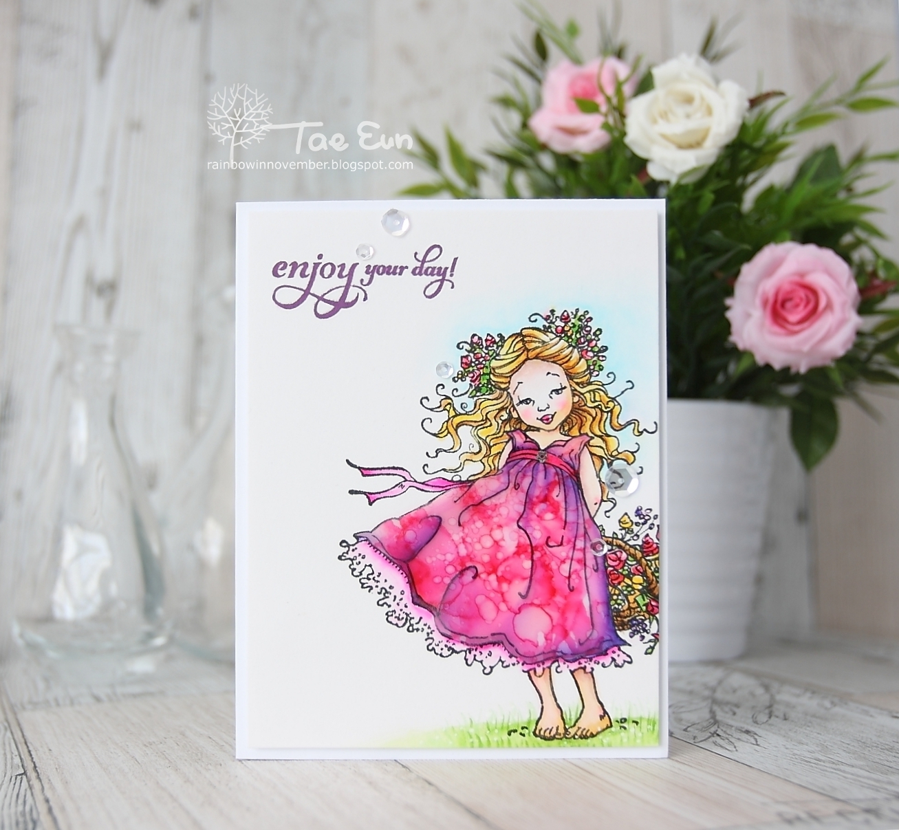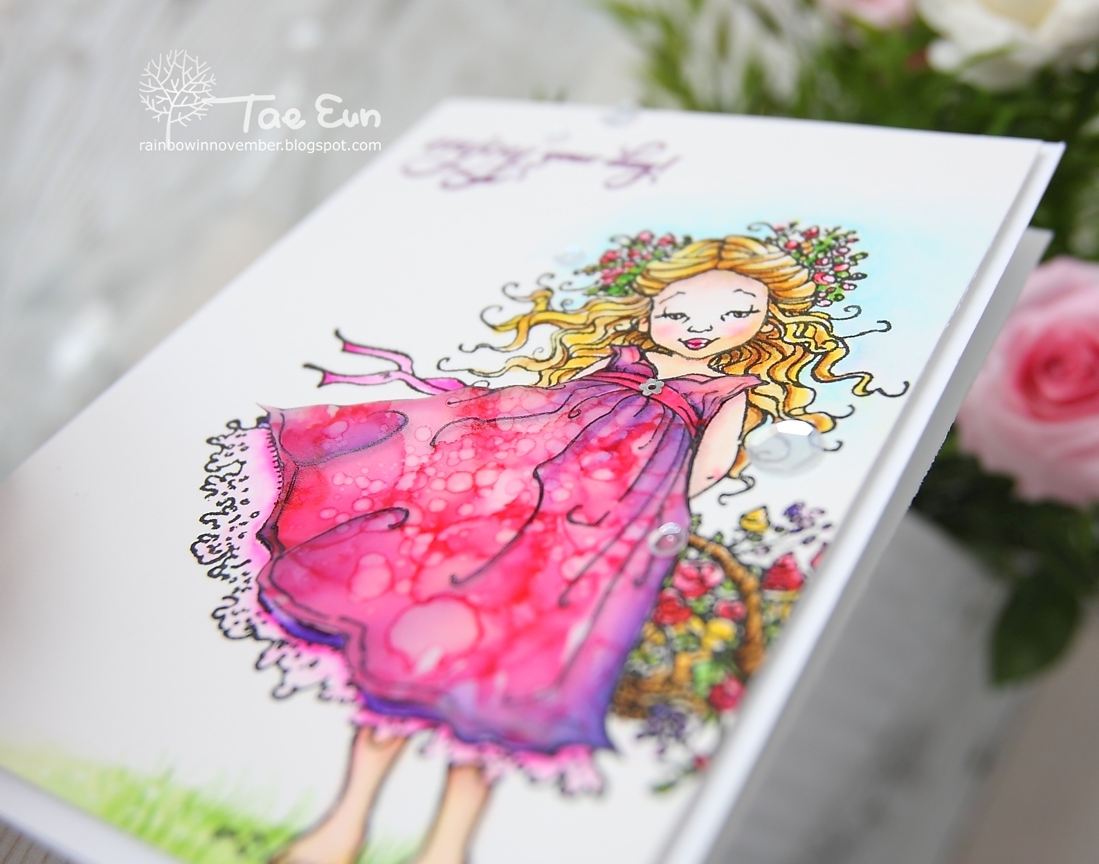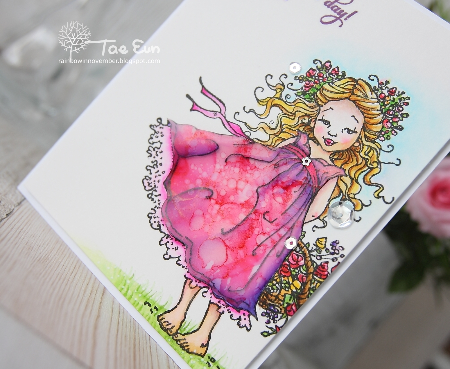 This stamp with a cute girl is called Flower Charm (Penny Black). I stamped it in black pigment ink on some Bristol smooth paper and colored the image with Zig brush markers. I added some accents with white gel pen here and there and stamped the sentiment by PB in purple.