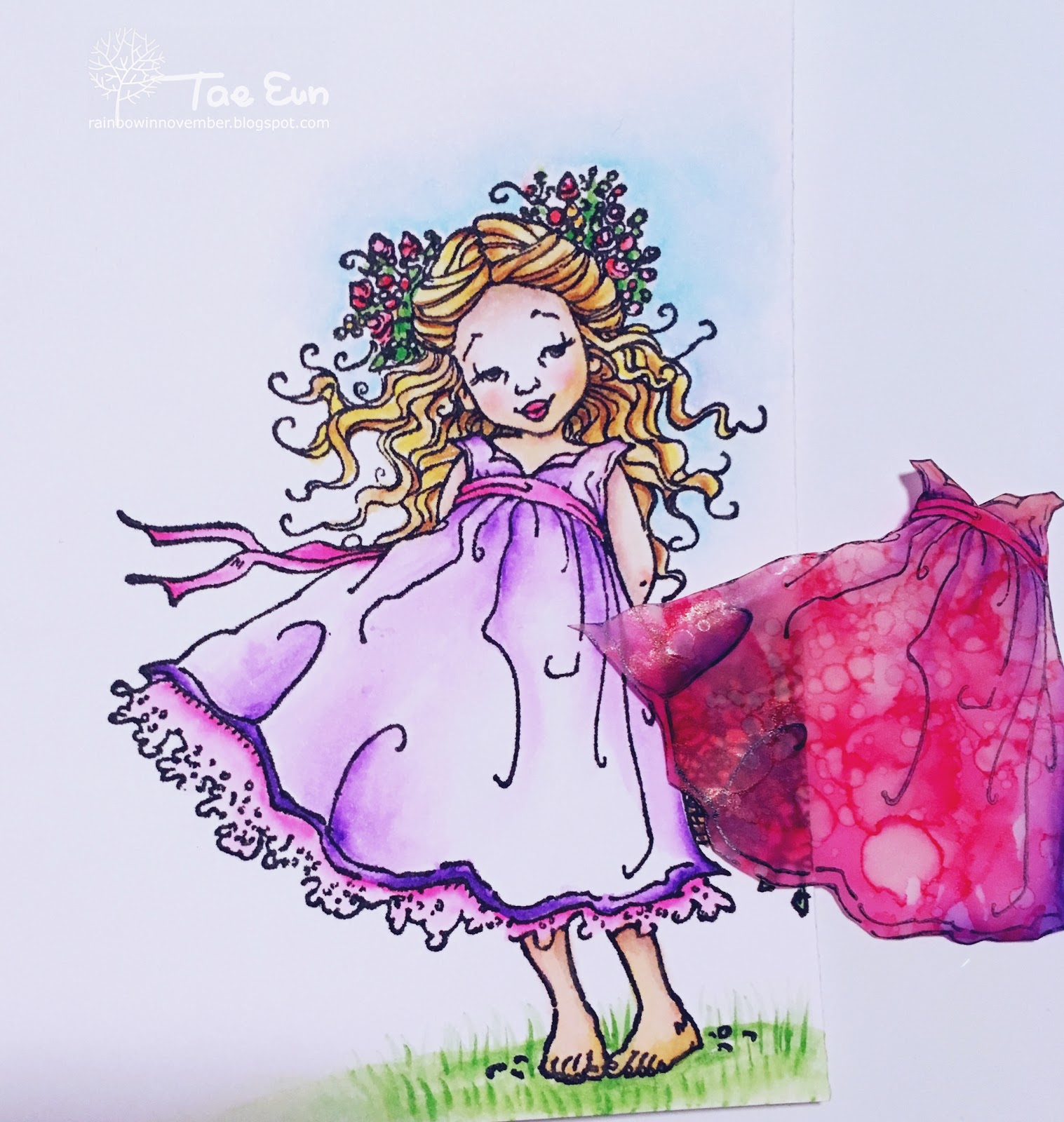 After coloring with alcohol inks the vellum warped quite a bit. But I love it as it gives the dress movement and dimension.