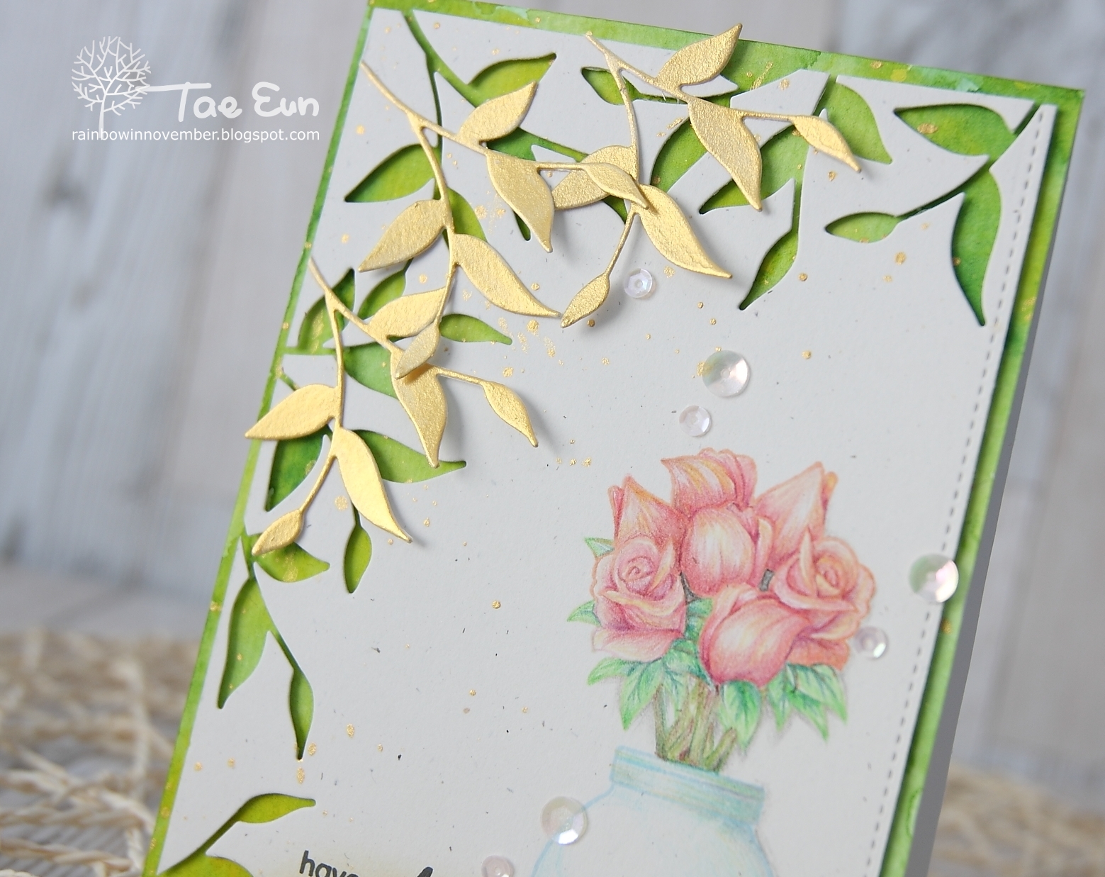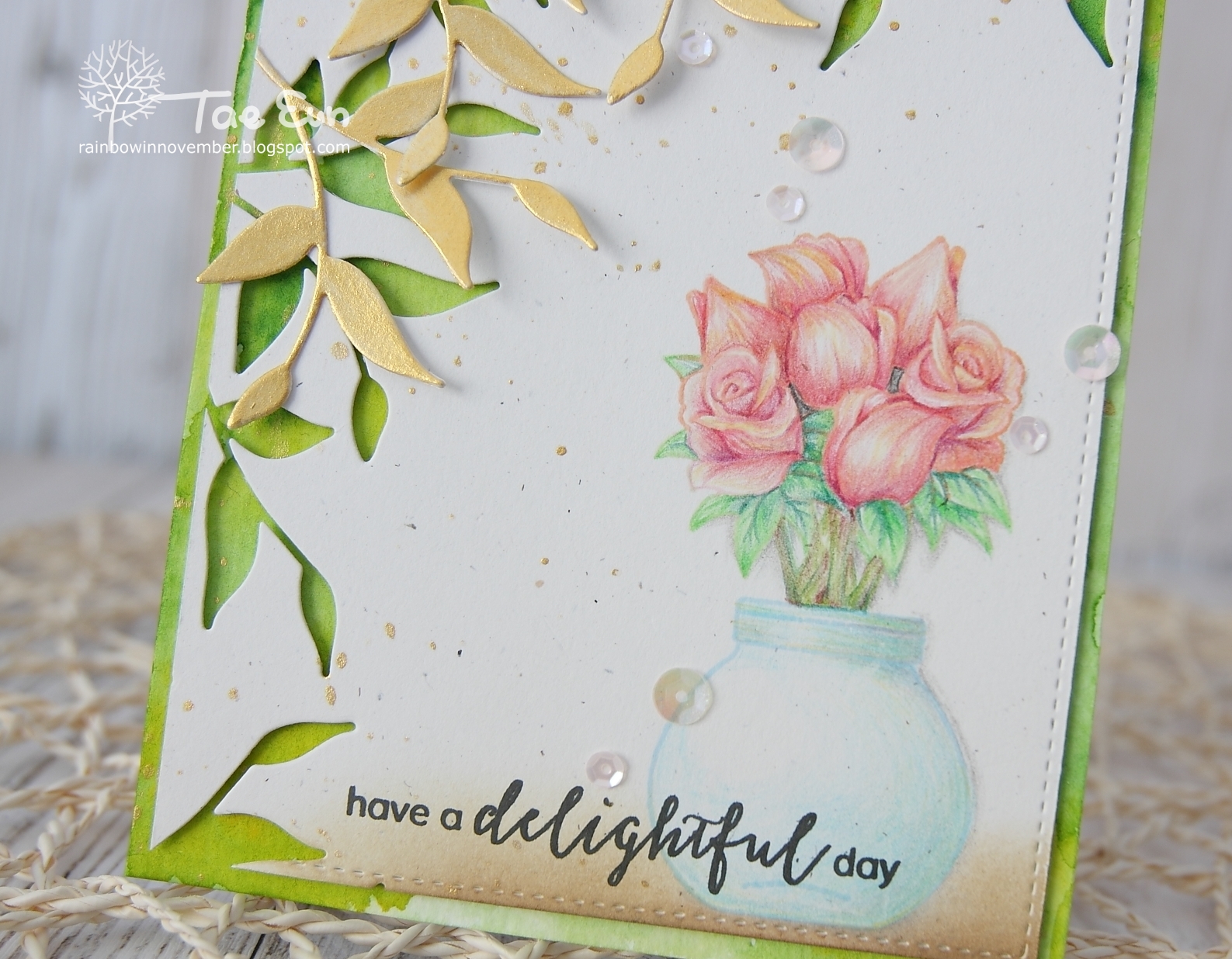 To start off I stamped a rose bouquet and the vase from Delightful Day stamp set from Clearly Besotted on Oatmeal cardstock from WPlus9 in light green, light pink and light blue respectively for the leaves, roses and the vase and colored them with Polychromos colored pencils. I then die cut the top and left part of the panel using the leaf die from Petal Cut Peonies Standalone dies by The Ton. For the green background I colored a A2 size watercolor paper panel using Gansai Tambi watercolor. I then splattered gold watercolor on the green panel and the front panel after masking the flower. I blended Vintage photo and Antique Linen distress ink on the bottom part of the front panel, added stitch lines on the right and bottom edge using Double Stitched Rectangle die from The Ton and foam mounted it on the green panel.