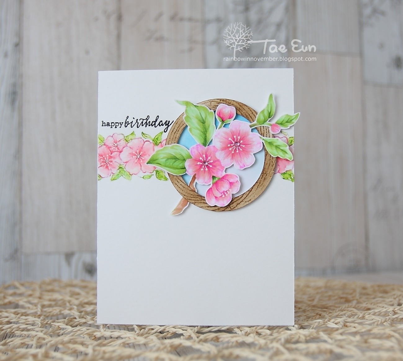 From several borders I chose one with cherry blossom and stamped it on a water color cardstock using Aquamarkers and Misti tool so that I could stamp the flowers in pink and the leaves in green.  I then colored the cherry blossom border with a bit of Zig markers along with blending using clear water. I then picked a cherry blossom image from Clearly Besotted, stamped it on a white cardstock using pink and green Memento inks, colored it with Copic markers and fussy cut it. The circle frame was cut with my Cricut. I stamped the Tree Ring from Concord&9th on it with Vintage Photo DI and blended the same color on it. I made a circle blended with some blue DIs as the background for the cherry blossom and glued it on the card. The cherry blossom was glued with the circle frame and foam mounted on the card. The sentiment is from Message Me by Clearly Besotted. It was a small sentiment just as what I wanted. I stamped it in black pigment ink and clear heat embossed it. For some bling and shine I added a coat of Wink of Stella, white stamen and some pink rhinestones on the flowers.