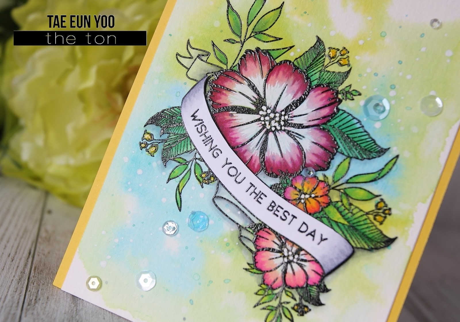 For this card I started off by making watercolor background. I created a watercolor wash on a watercolor cardstock in green and blue using several Distress inks, splattered clear water and blue ink on it. I then stamped Wildflower Banner in copic-friendly Caviar Hybrid ink. I colored the image using Copic markers and colored the center part of the petals using white gel pen. For more sharp image I stamped it again in Caviar Hybrid after coloring and clear heat embossed it with the help of Misti tool. I wanted the sentiment to pop, so I decided to make the banner on a separate white cardstock. I stamped the sentiment in Noir, fussy cut the banner and foam mounted it on the card. To finish off I added a few sequins from Summer Skies (debuting on Day4) and Winter Thaw Couture Mix.