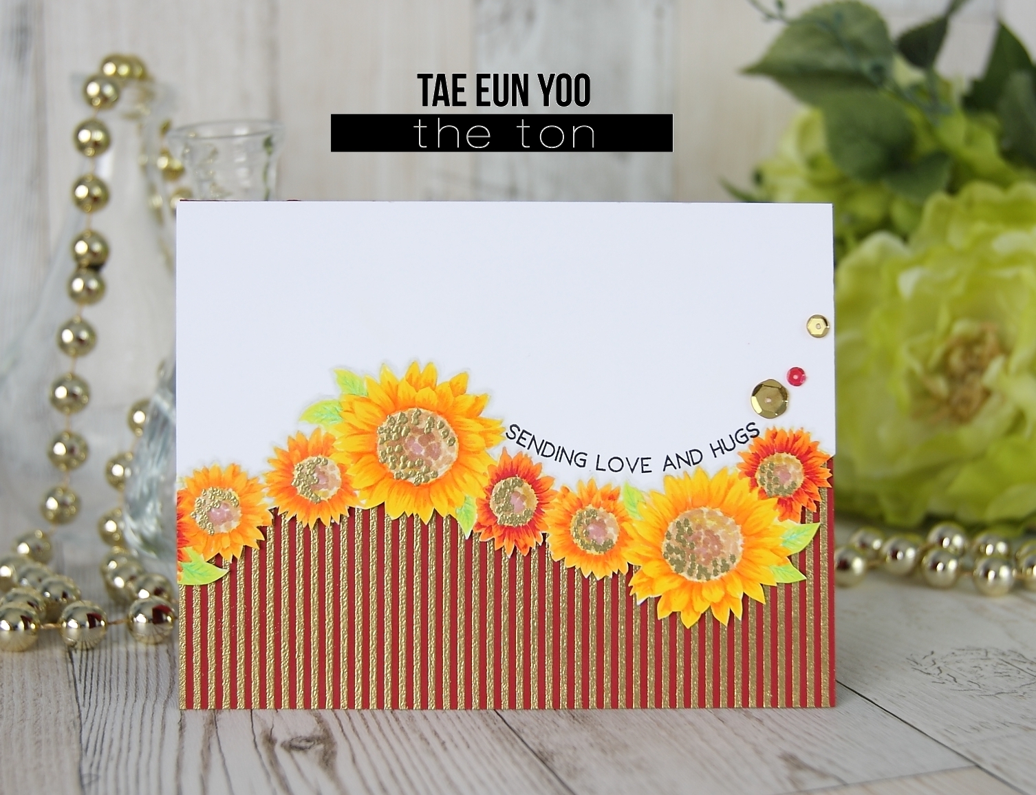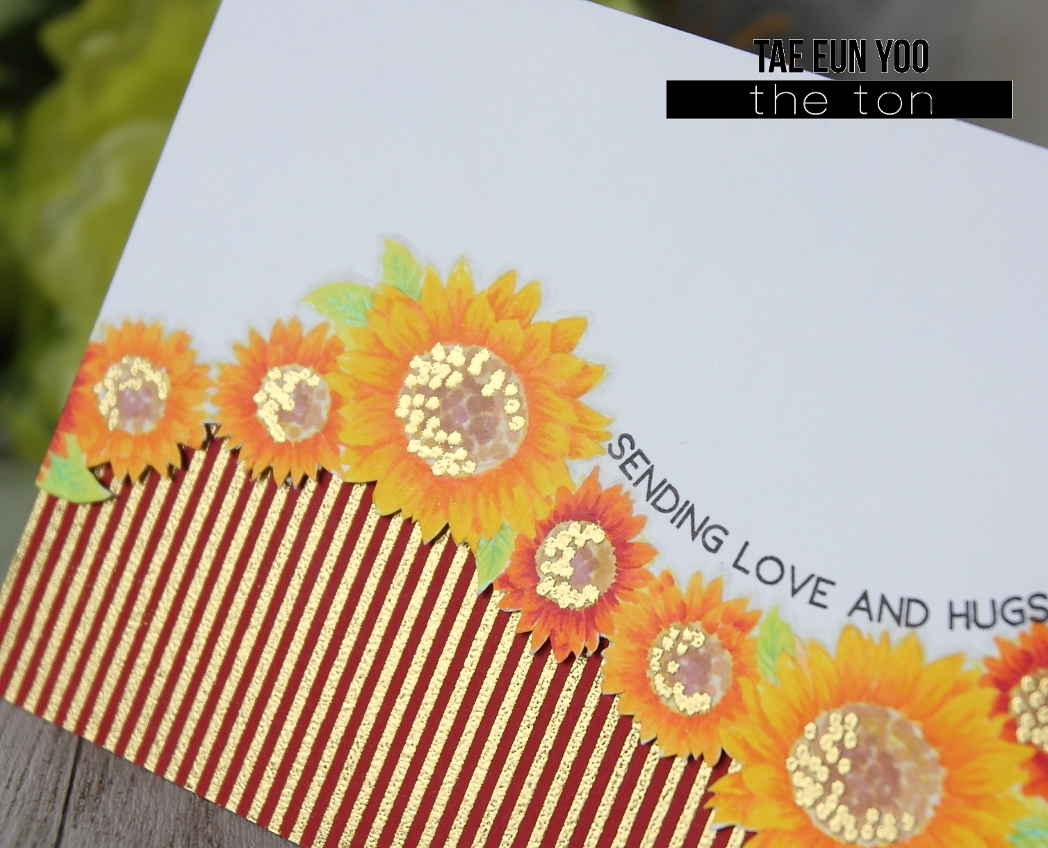 To start off I stamped Sunflower Cluster Mini on a white cardstock three times to make a wavy line out of them. I used Vanilla Frosted Cupcake for no-line coloring. I colored the sunflowers with Copic markers and added details using Polychromos pencils. I added gray shade along the upper outline and fussy cut the lower outline of the image. I foam mounted the panel on my red card base on which I gold heat embossed the Minor Stripes. I borrowed the sentiment from Wildflower Banner, stamped it in Noir. It was already curved so perfect to align to my image. To finish off I added two gold sequins from Medallion Gold and one red from Valentine Frosting Couture Mix.