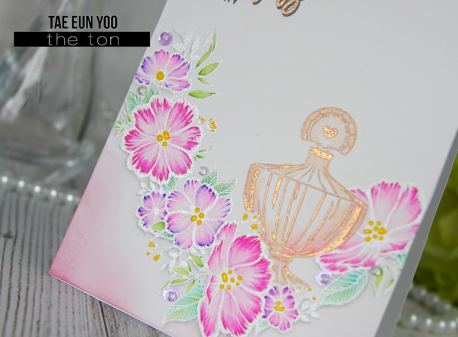 I stamped the flower cluster from Wishful Wildflowers in embossing ink and heat embossed in white on a Bristol smooth paper. After masking the image I heat embossed a bottle from Marvelous Perfumes stamp set in Rose Gold. I then masked the bottle and white heat embossed one solo flower to make a faux triangle edge. Coloring was done with Zig brush markers. I added gray shade to the lower edge of the image for some dimension and blended Hollywood Star on the bottom part of the panel. The sentiment is from Marvelous Perfumes. I stamped it in Light Onyx first and heat embossed only “fabulous” in Rose Gold slightly offset. Finishing touch was a few sequins from Violet Sprinkle Couture Mix and some yellow dots using Pico embellisher.