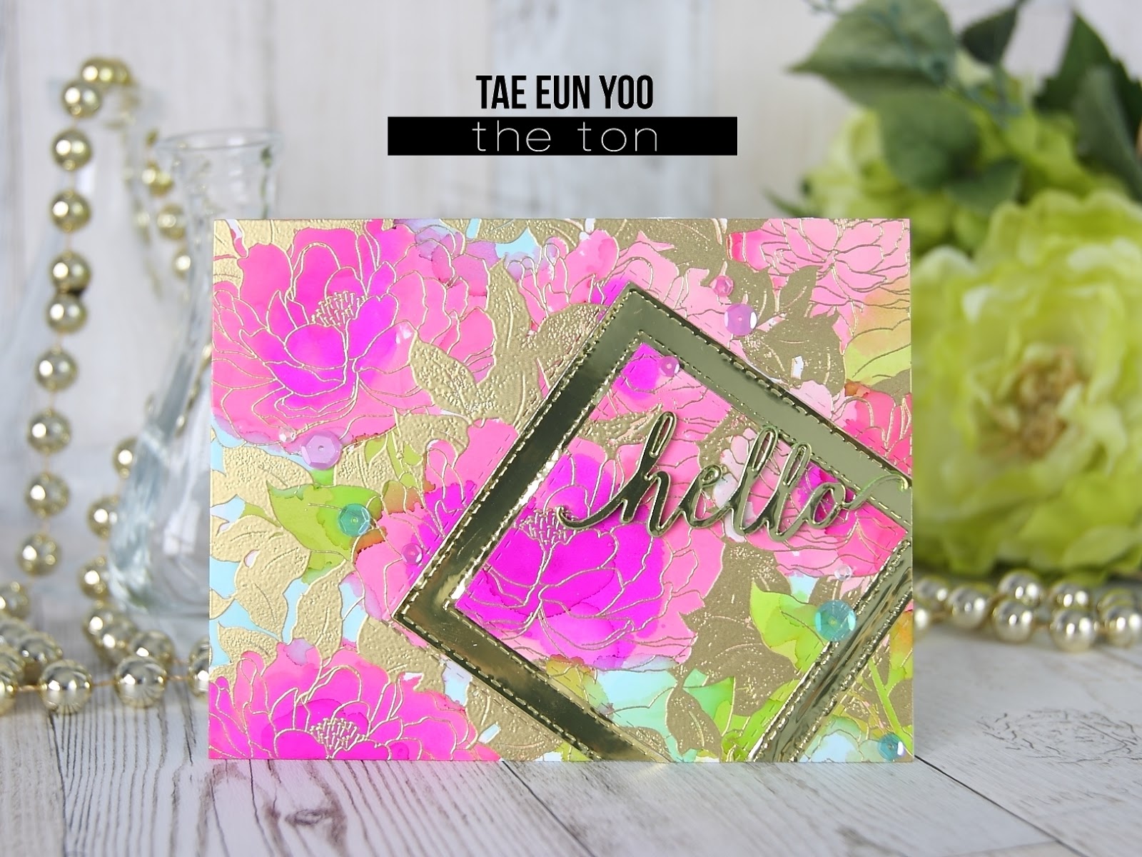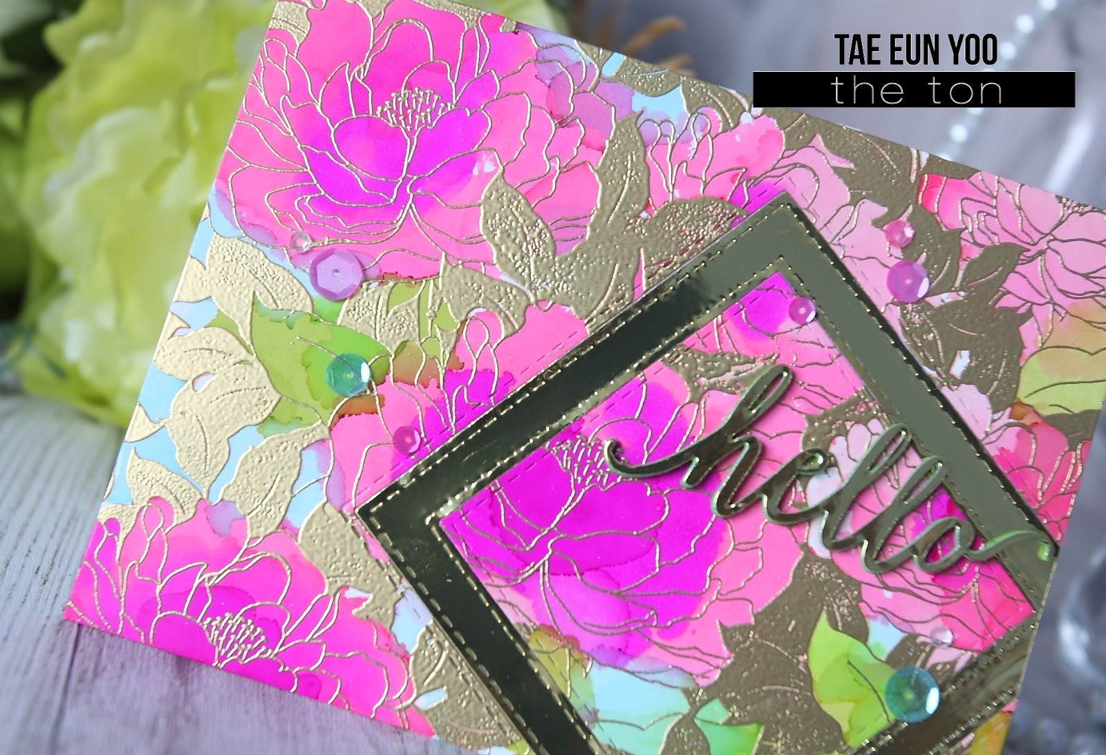 I stamped Peony Crush in Vanilla Frosted Cupcake as my guide for coloring. I applied the alcohol inks by tilting the bottle and the glossy cardstock so that I could control the flow. I used Raspberry, Flamingo and Shell Pink for peony flowers, Limeade and Citrus for leaves and Aqua for background. After the ink was dry I stamped the Peony Crush again in embossing ink and heat embossed it in gold. To add some interest onto my card I cut a square frame using Double Stitched Square dies from my colored panel and once again from Adhesive Gold Foil paper. I inlaid the gold frame into the place where I took off the colored frame. I die cut the Adhesive Gold Foil paper and some green fun foam using Hello word die and stacked them onto my card as shown in the picture.