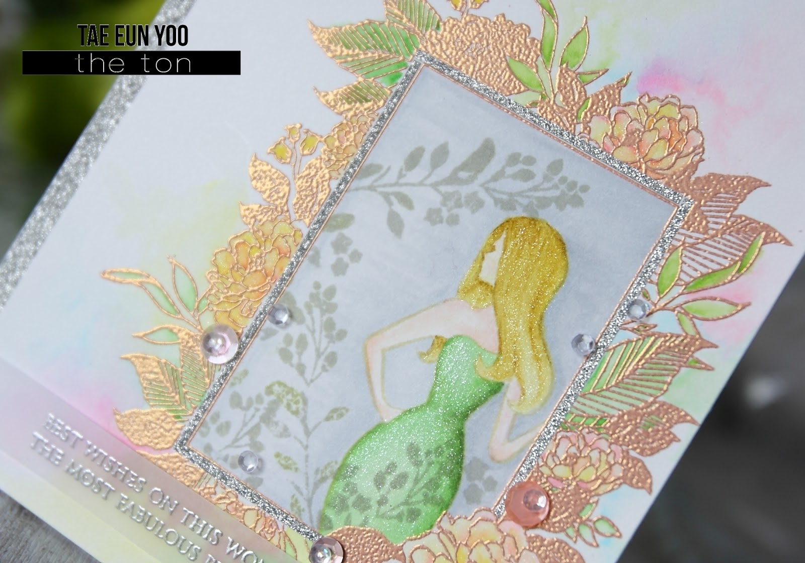 I used the Pretty Mail stamp set as a frame for a picture of the lady from Born Classy. To start off I heat embossed the image in Rose Gold on some Bristol Smooth paper. I then made a mask to stamp the lady inside of the frame in Vanilla Frosted Cupcake. I colored the flower cluster around the image using Zig brush markers and added some pink-green-blue wash around it. I colored the inside of the frame with Copic markers, added clear glitter and then stamped some branch from Pragmatic Wreaths stamp set (debuting tomorrow) in Crystal Pewter.