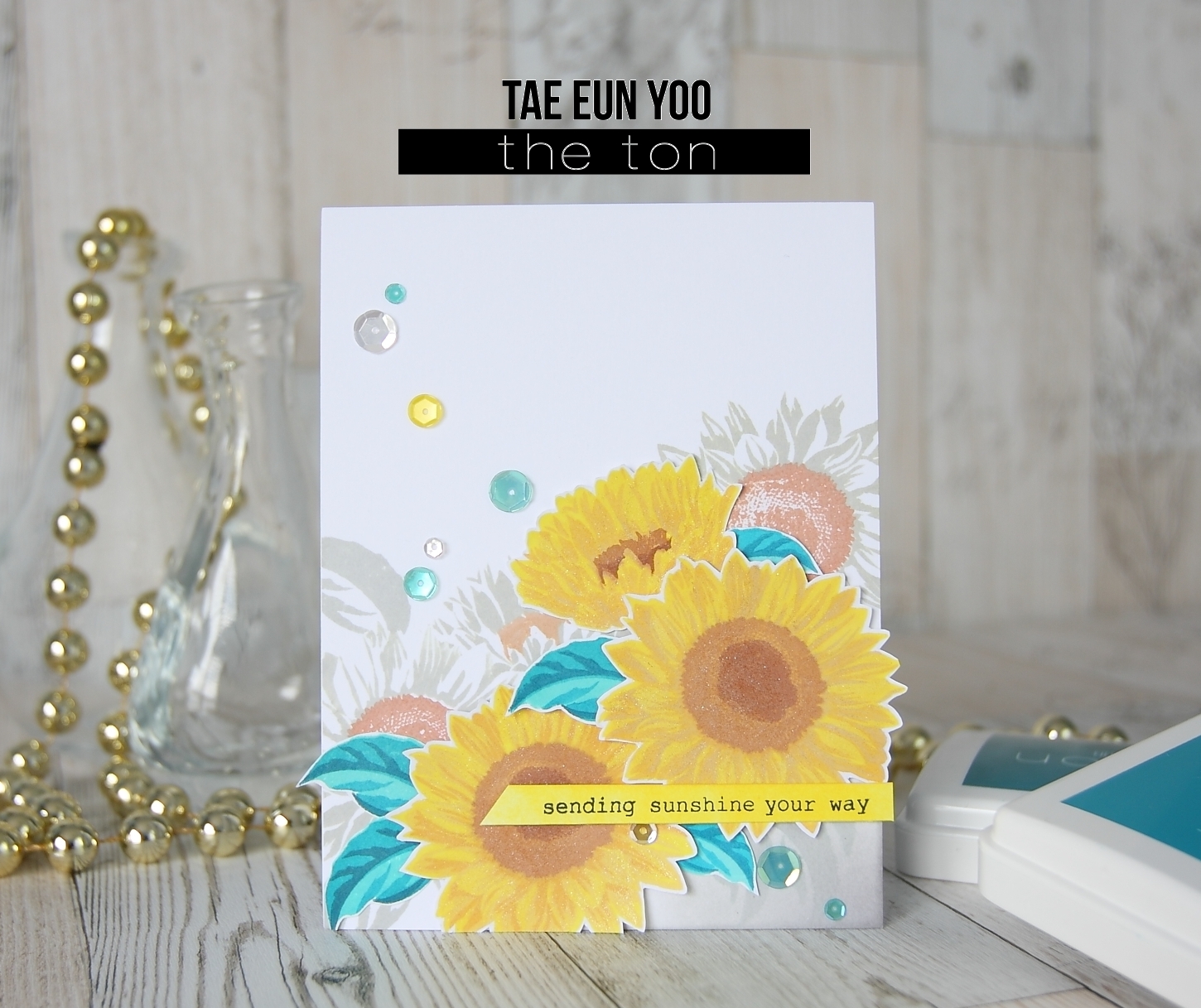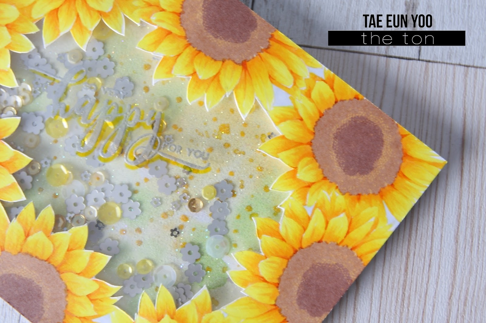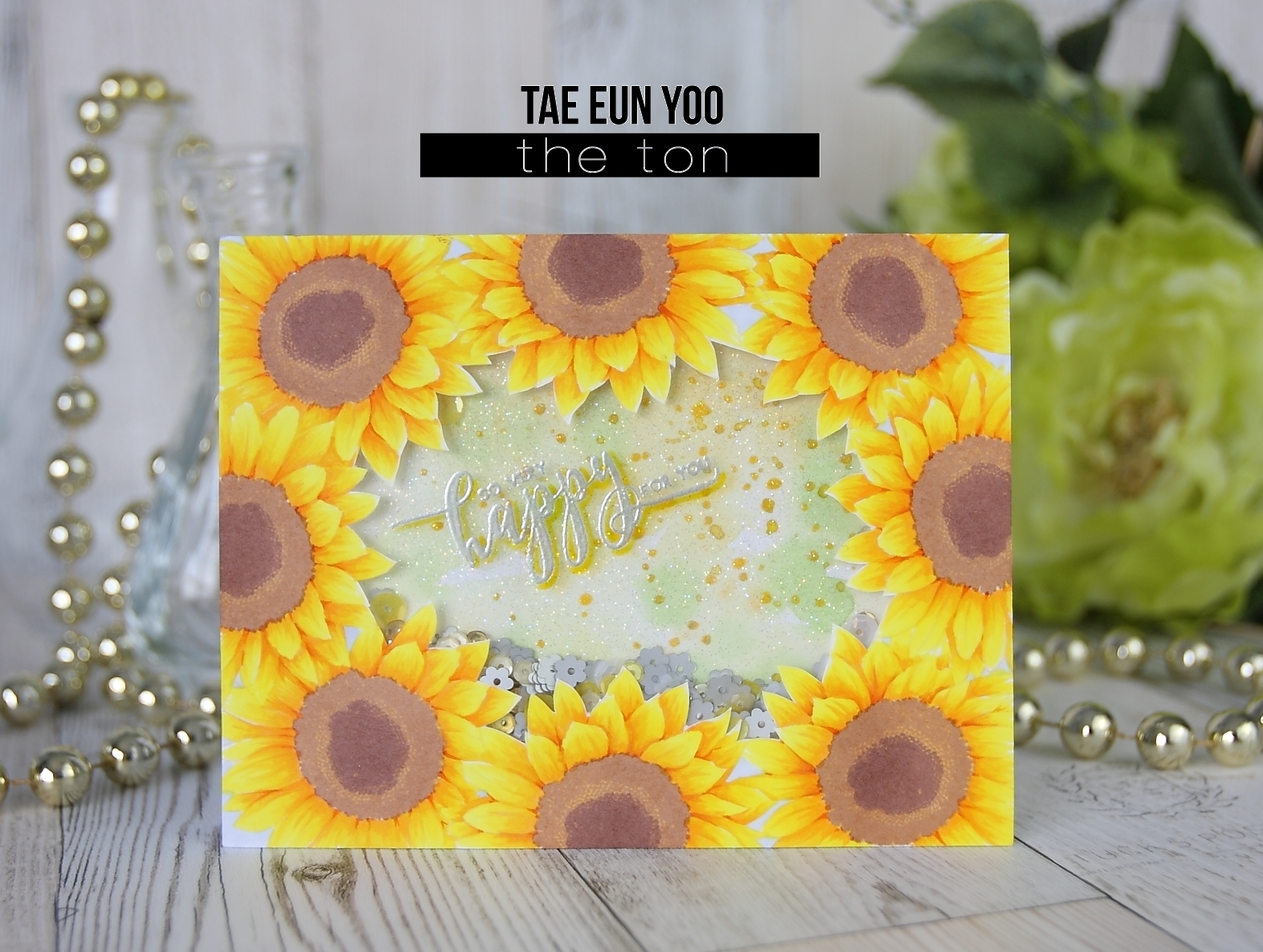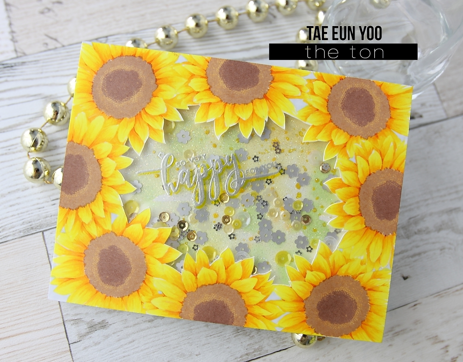 I stamped the Fresh Cut Sunflower outlines in Vanilla Frosted Cupcake around the edge along with masking. I stamped the flower center in layer using Cocoa Collection. I then colored all the flower petals with Copic markers. After done with coloring I fussy cut the center part out to make the shaker window.