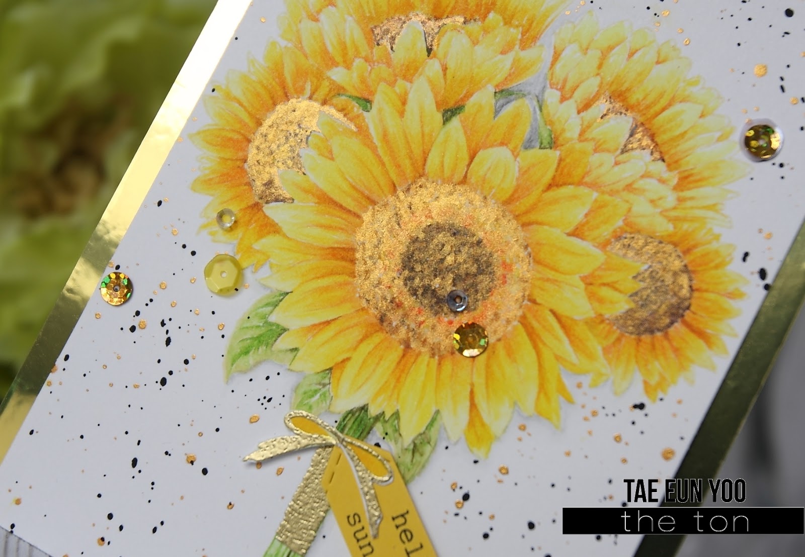 My first card is featuring Sunflower Bouquet. I stamped the image on a Bristol smooth card stock in Vanilla Frosted Cupcake for no-line coloring. I colored it using Zig brush markers and some gold watercolor on the flower center, added subtle shade in gray around the bouquet and splattered some black and gold watercolor after masking the bouquet. The string was gold heat embossed. I then trimmed both sides of the panel and foam mounted it on the card base, on both sides of which I added Adhesive gold foil paper. The sentiment is from Fresh Cut Sunflowers. I stamped it in Noir on a piece of yellow card stock, cut a fishtail arrow from it using a corner of Double Stitched Square Dies and foam mounted it on the string and added the gold heat embossed bow.