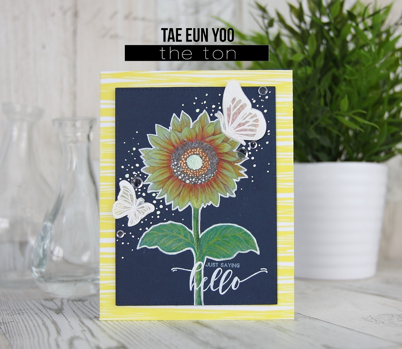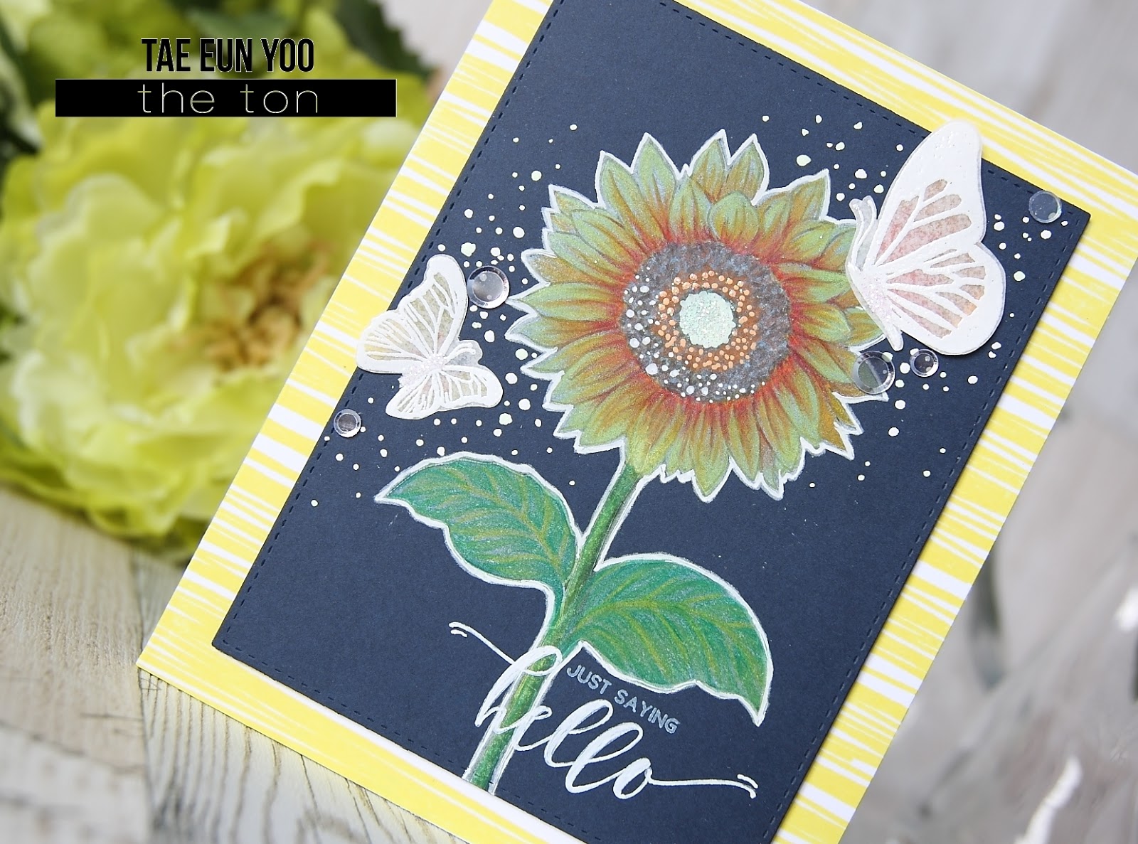 For black magic coloring I used a dark blue card stock. I stamped the solid image from Fresh Cut Sunflowers in Hampton White pigment ink. I then stamped the outline of the sunflower in Crystal Pewter on the solid image as my guide for coloring. Coloring was done with Polychromos colored pencils. I found the image too dark so I decided to add some white accents and outlines using a white gel pen. I die cut the colored panel using a Double Stitched Rectangle die and foam mounted it on the card base on which I stamped the Freestyle Stripes in Lemon Drop. The white heat embossed vellum butterflies are from Beautiful Butterflies 3 and Flutter Mini stamp sets. I stamped the sentiment from Sunflower Bouquet in Hampton White pigment ink. To make it brighter I went over the sentiment with a white gel pen. To finish off the card I added some Glass Slippers Round Confetti and some glitter on the flower center and on the body of butterflies.