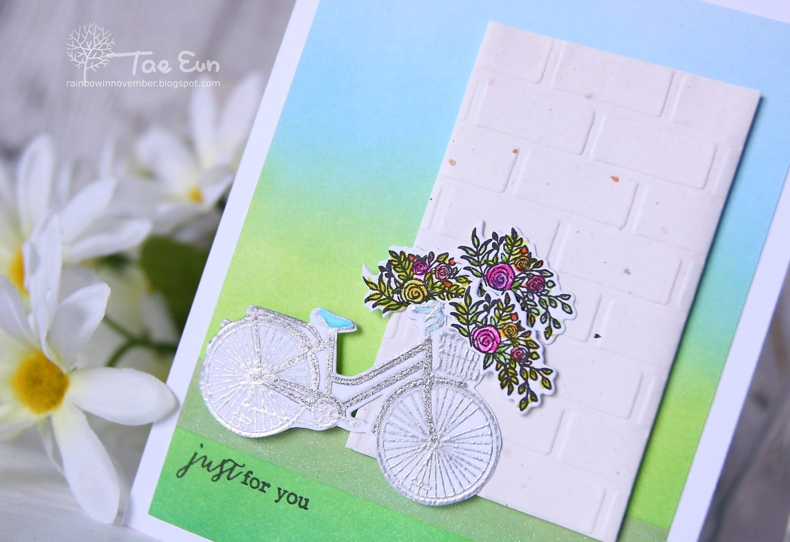 When I saw the inspiration photo at Inspired by All the Little Things, this bicycle stamp by The Ton popped in my mind. It is called Beautiful Day Bicycle. As it has a small flower cluster, which fits on the basket, it looked perfect for my card.