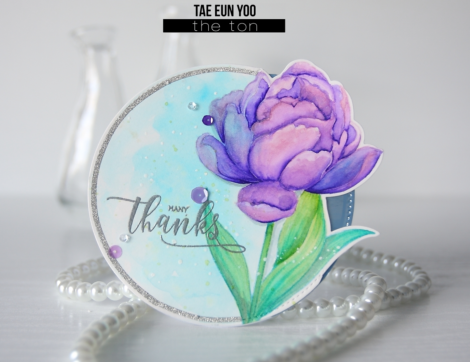 To start off I made the shaped panel and a circle base first. I die cut the front panel from Bristol smooth paper using Double Stitched Circle die and the coordinating die of Lucky Tulip with partial die cutting technique. The card base was cut from a folded white cardstock with Double Stitched Circle die. I stamped the Lucky Tulip on the front panel, the flower in Ballet Slippers and the stem and leaves in Cali Blue, and colored the image using Zig Brush pens and Gansai Tambi pearl colors. You can see the shimmer better on the close-up picture. I then added some splatters in green and white and silver heat embossed the sentiment from Sunflower Bouquet. Before I mounted the front panel on my circle card base I adhered a piece of light blue Adhesive Foil Paper on the base.