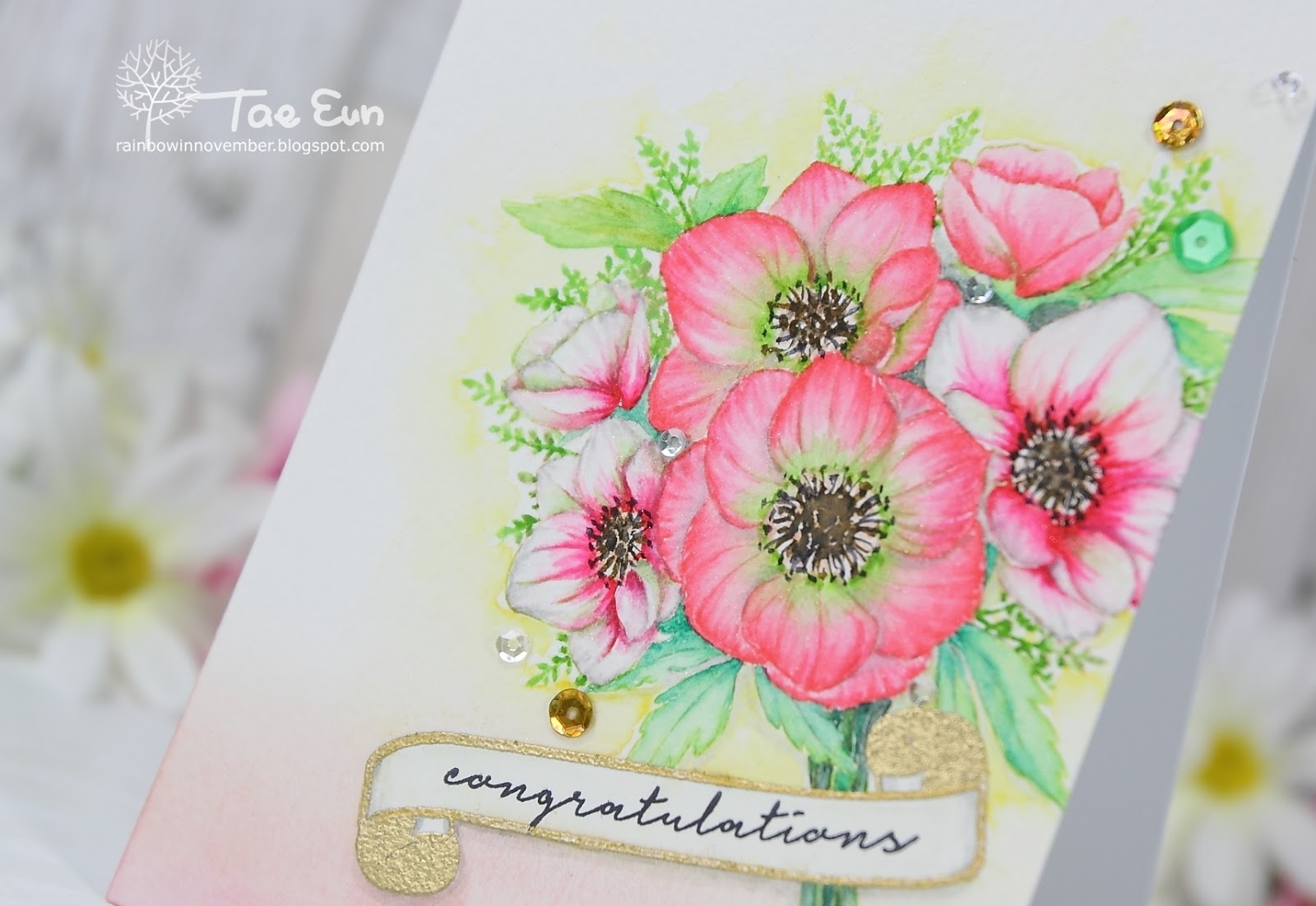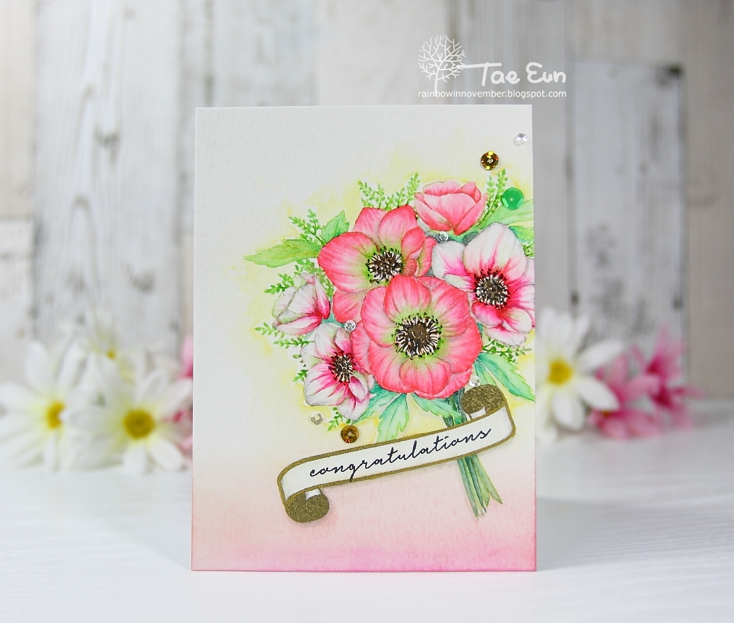 This beautiful image is Anemone Bouquet from The Ton. First I gold heat embossed the banner from Basic Banners stamp set from The Ton as well. I then stamped the bouquet in Antique Linen DI on Canson Watercolor paper after masking off the banner. I googled for some images of anemone flowers and colored my flowers following the color scheme I liked. I used Zig markers to color.  I blended Tattered Rose and Picked Raspberry on the bottom of the panel. The sentiment in Noir is from Penned Sentiment stamp set. To finish off I scattered some sequins from Belle’s Dress and Wintergreen Frost Couture Mix from The Ton.