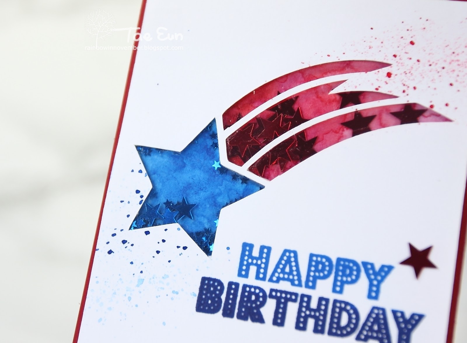 I started off by making a cutting file for a star with comet tail and cut it from a white card stock with my Cricut. For the background I colored a watercolor panel using Gansai Tambi watercolor in blue for the star and in red for the comet tail. I splattered blue and red watercolor on the front panel and stamped the sentiment from Hero Arts in Parisian Blue and True Navy. I adhered a clear acetate to the shaker window and assembled the shaker card by adding some blue and red star sequins as my shaker elements. I chose a red card base for my card and finished it off by adding a red star sequin.