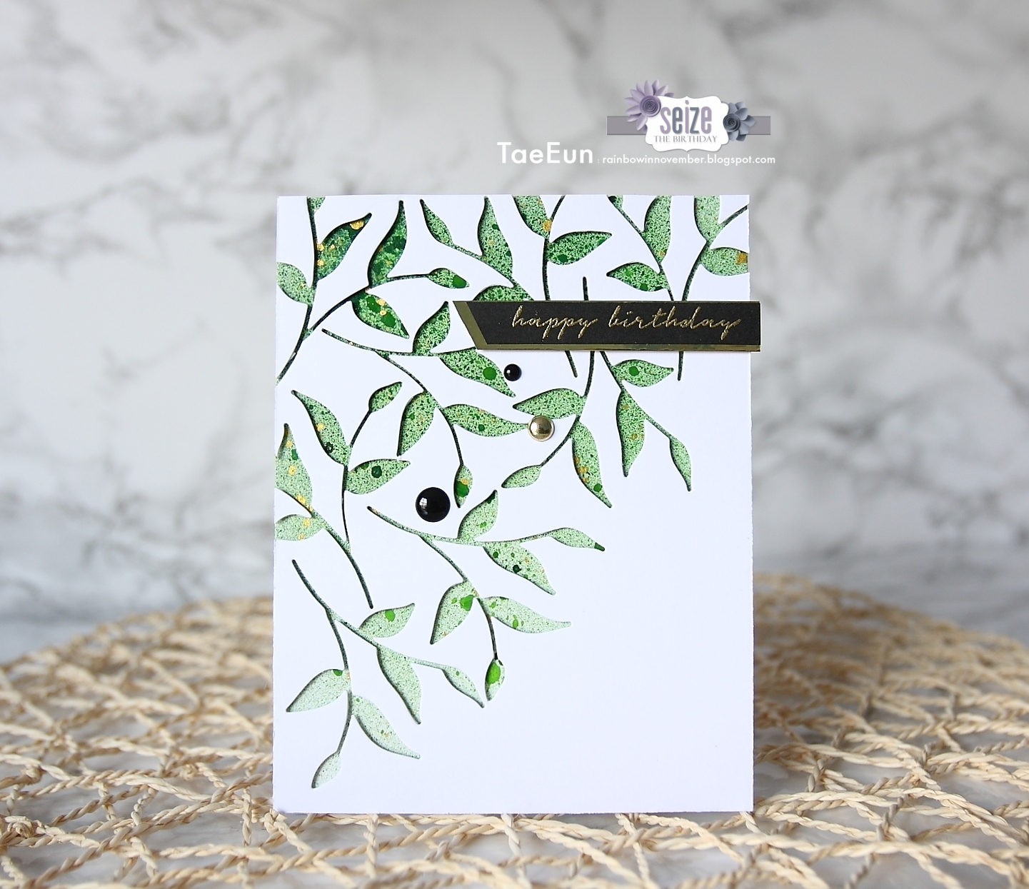I used a negative die cut panel from my stash. I needed white greenery die cuts for my previous cards and this negative panel has been sitting since then.