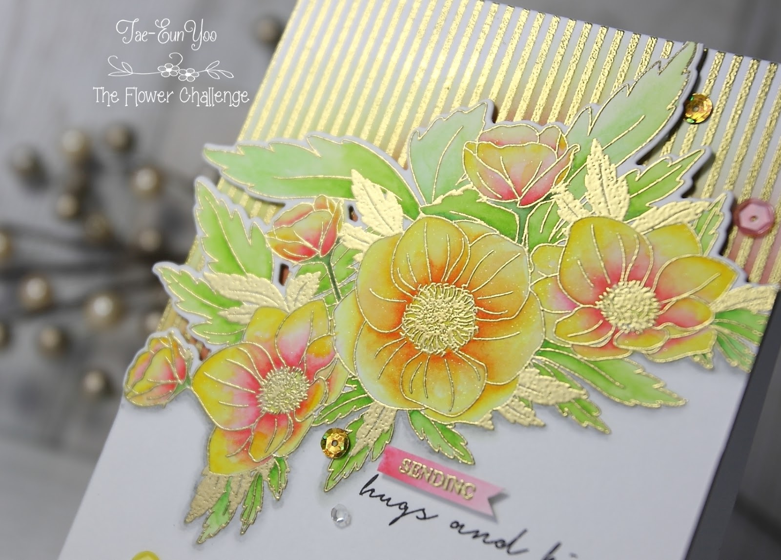 This Anemone cluster is from The Ton and is called Anemone Wishes. I gold heat embossed it on a Canson Bristol paper and colored it using Koi watercolor. I then partially die cut it with coordinating die only the upper edge. I gold heat embossed the Minor Stripes on my card base and blended some DIs in yellow and pink on the area surrounding the Anemone cluster. The sentiment is from Penned Sentiments. I made a strip in pink using watercolor for gold heat embossed “Sending” and foam mounted it and stamped the other sentiment in Noir on the front panel. The front panel was popped up with some foam adhesives. I scattered some sequins from Guava Sparkle and Belle’s Dress Couture Mix to finish off the card.