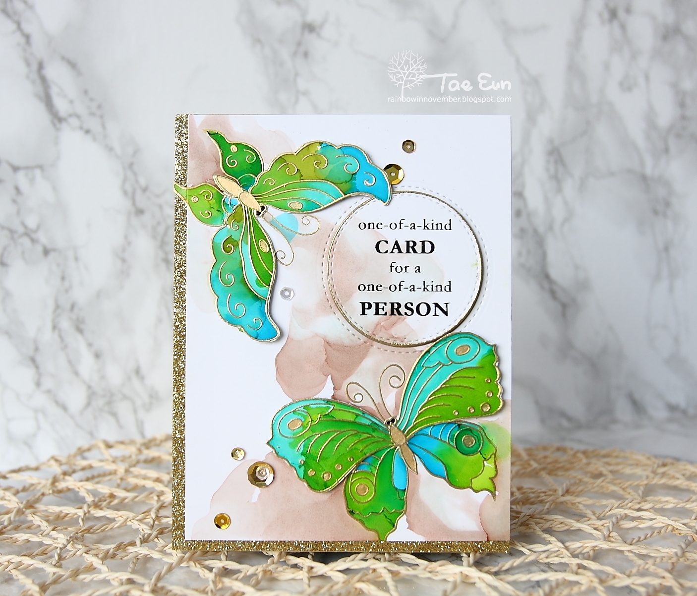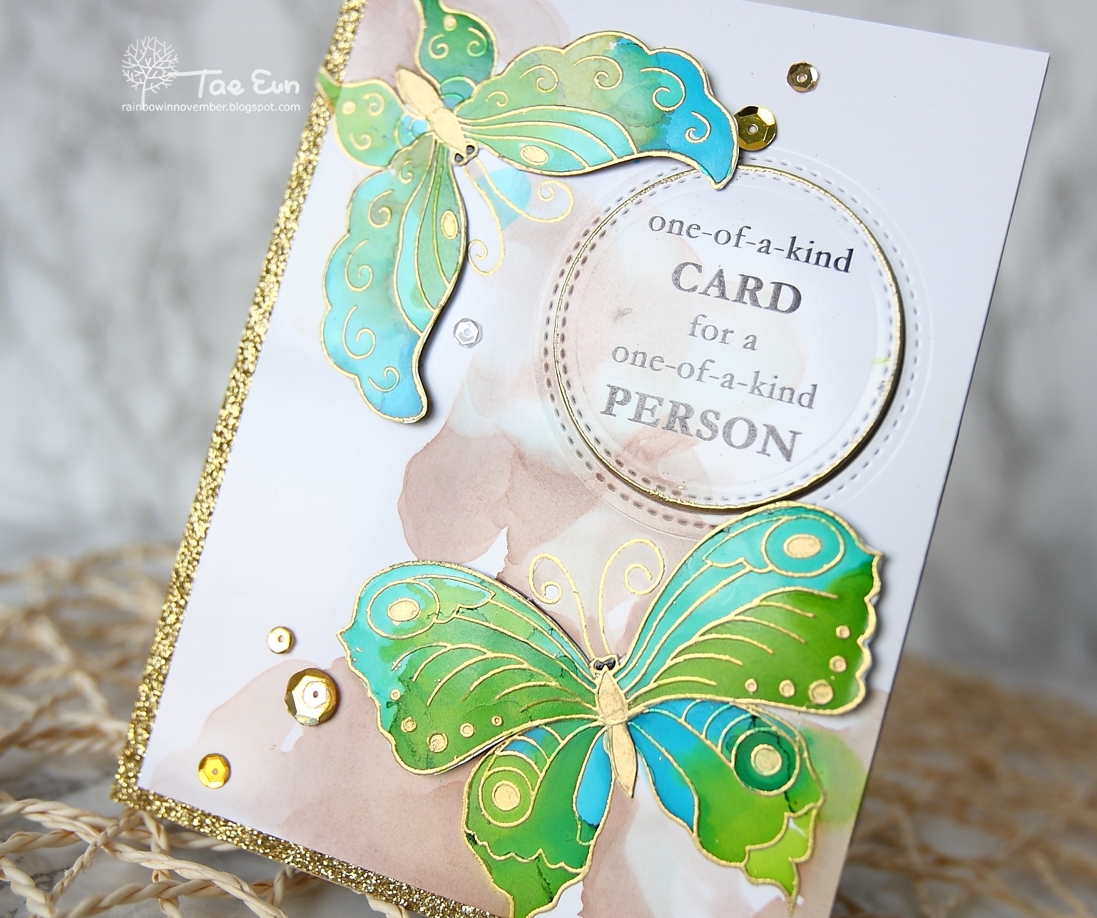 The sentiment is from the same set. I die cut a circle from the colored panel. I gold heat embossed the edge of the circle and stamped the sentiment in StazOn black. I adhered gold glitter tape from New Day Card Kit on the left and bottom edge of a kraft cardbase. I trimmed down the front panel slightly and mounted it flat on the cardbase. I then put the circle with the sentiment onto the place using some foam adhesive. The fussy cut butterflies were then added on the butterflies of the front panel. I glued the body directly on the body of the butterfly on the front panel and added some foam adhesive under the wings to create some dimension.