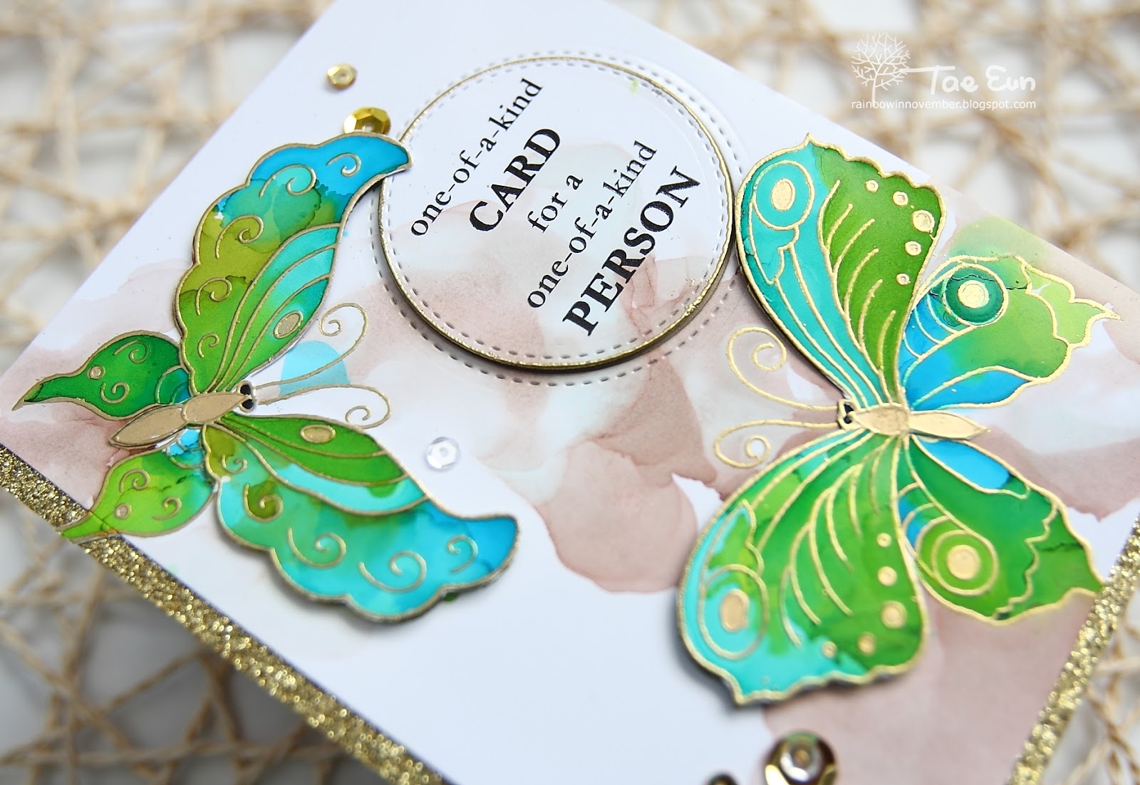 To start off I gold heat embossed the butterflies from Bejeweled stamp set on a glossy cardstock. I then applied the alcohol inks on the butterflies. I mainly used Patina and Limeade and a little bit of Turquoise and Citrus. I added gold Mixative on the body and on dots of the wings. I gold heat embossed and colored two more butterflies on a separate glossy cardstock and fussy cut the wings and body part of them. To create the brown background I dripped rubbing alcohol first and a drop of Hazelnut on the alcohol puddle to lighten the color. I moved the ink and alcohol mix to the direction I wanted by tilting the paper.
