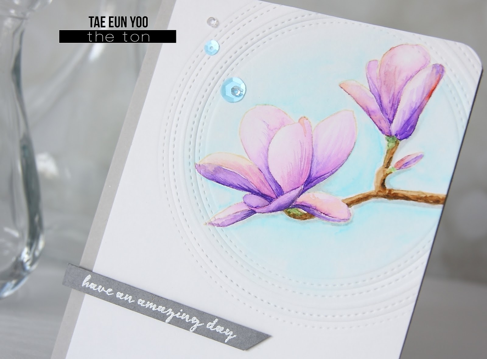 I stamped the magnolia image in Antique Linen DI on some watercolor paper and colored it using Zig brush markers. I added the light blue background in a circle shape and dry embossed two Double Stitched Circle dies around it. I foam mounted the panel on a light gray cardbase as shown in the picture. The sentiment is from Magnificent Magnolias as well. I white heat embossed it on a strip of dark gray cardstock and foam mounted it onto the card. To finish off I rounded one corner and added a few sequins from Blue Ice.