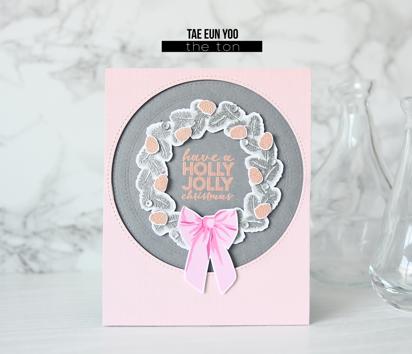 I started by stamping the wreath and the bow. For the first layer of the wreath I used Crystal Pewter and the bow was stamped in Rose Quartz, Hollywood Star and Cosmopolitan Pink. I silver heat embossed the second layer of the wreath and cut it with my cutting machine (coordinating dies will be available on Sep.7th as well.). I heat embossed the second layer of pine cone several times in Rose Gold. I then fussy cut the bow and the pine cones. I dry embossed the dark gray cardbase using two Double Stitched Circle dies and cut out a circle from a A2 sized soft pink panel. I heat embossed the sentiment from Christmas Wreath Builder in Rose Gold on the cardbase. To assemble my card I foam mounted the pink panel and the wreath. The pine cones and the bow were added using some foam adhesives. To finish off the card I adhered some sequins from New Year Couture Mix on the wreath.