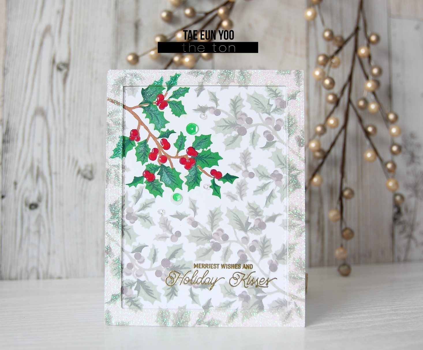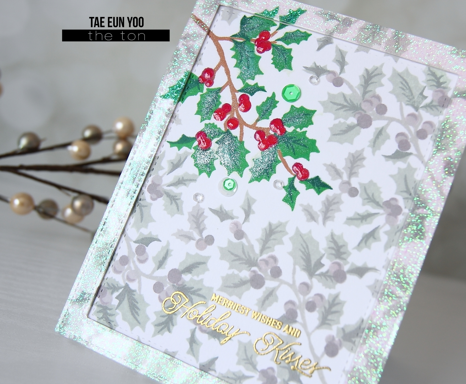 First I stamped one holly branch on top left of a white panel. I used Bright Fern and Basil Mojito for the leaves, Lipstick Red and Pink Derby for the berries and Found Topaz for the stem. I then filled the panel with holly branches in Crystal Pewter and Smoky Quartz. Obviously the stamps were not completely clean so the images have a hint of colors I used for the first branch :). It wasn’t intended, but I like it. I then cut out a frame from this panel using two Double Stitched Rectangle dies and one more frame from Adhesive glitter paper (glossy fine transparent) and adhered it on the frame from stamped panel. The front panel was taped flat on the cardbase and the frame using some foam adhesives. The sentiment is also from Holly Branch set. I heat embossed it in gold. Some sequins from Frosted Spearmint were my finishing touch.