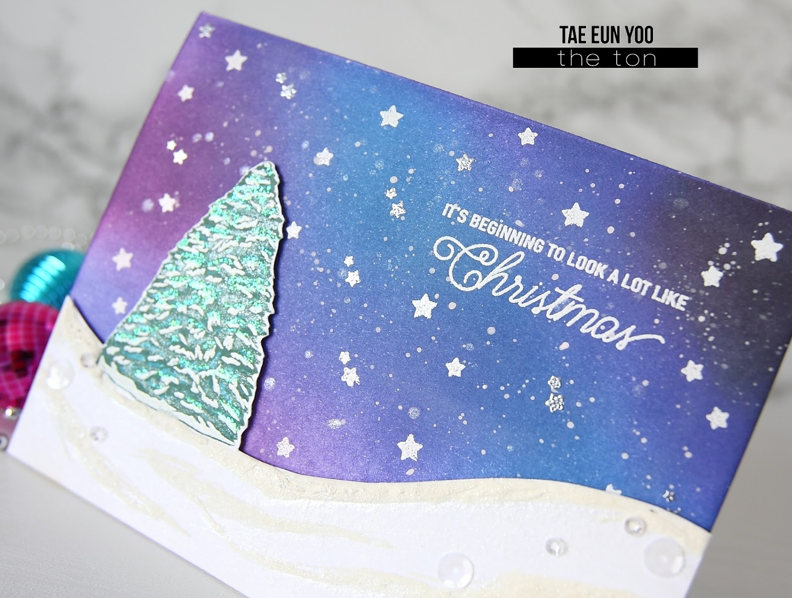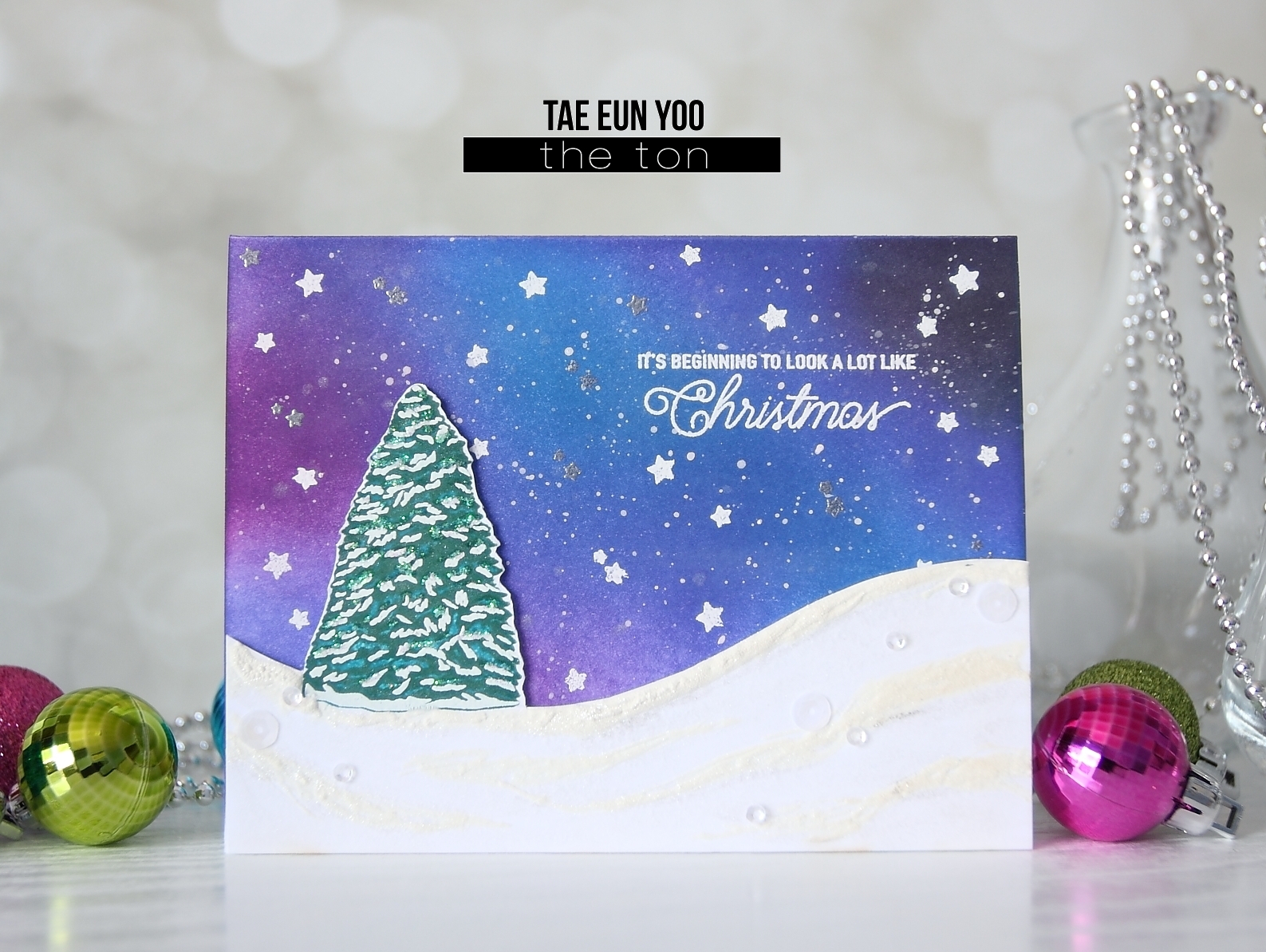 I stamped the pine tree in Ocean Teal and Everglade Moss on a A2 sized white panel. I heat embossed the last layer of the pine tree in white to represent some snow. I then drew a curvy line as a snowy hill and cut the panel along the line and outline of the pine tree. I added snow on the hill using a Snow pen. To create the background I blended Violet Fringe, Plum Wine, Azurite, Deep Sapphire and Light Onyx, splattered some white ink and some pearlized water on it, and white and silver heat embossed some little stars from Star Trails set. The sentiment from Holly Branch was white heat embossed. The background panel was glued flat on the cardbase and the panel with the pine tree was foam mounted on it. For more shine I covered the hill with glitter using a clear glitter pen and added Crystal Stickles here and there. To finish off I scattered some sequins from Blue Ice on the snowy hill.