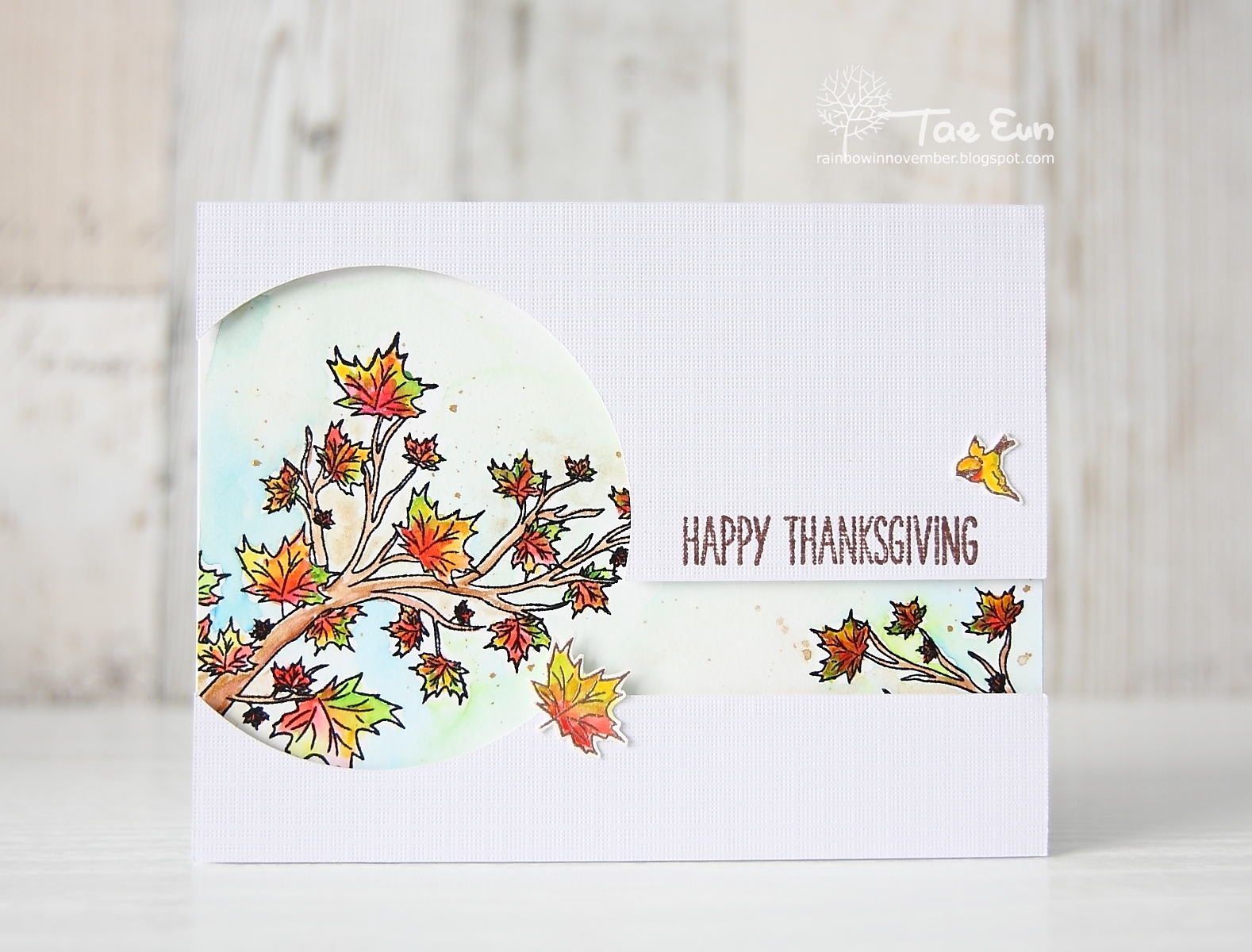 I stamped the branches on a mixed media panel in Versafine onyx black ink and clear heat embossed them. I watercolored the branches and background. While coloring I added a little bit gold (Finetec) on the stem and background, and splatters in gold as well. The front panel was cut with my Cricut from a textured white cardstock. I’ve made the cutting file according to the sketch. The sentiment was heat embossed in bronze. I heat embossed the little bird and a maple leaf on a separate paper in bronze and watercolored them before I fussy cut them. The front panel was foam mounted on the colored panel and I added the bird and the maple leaf to finish off the card.