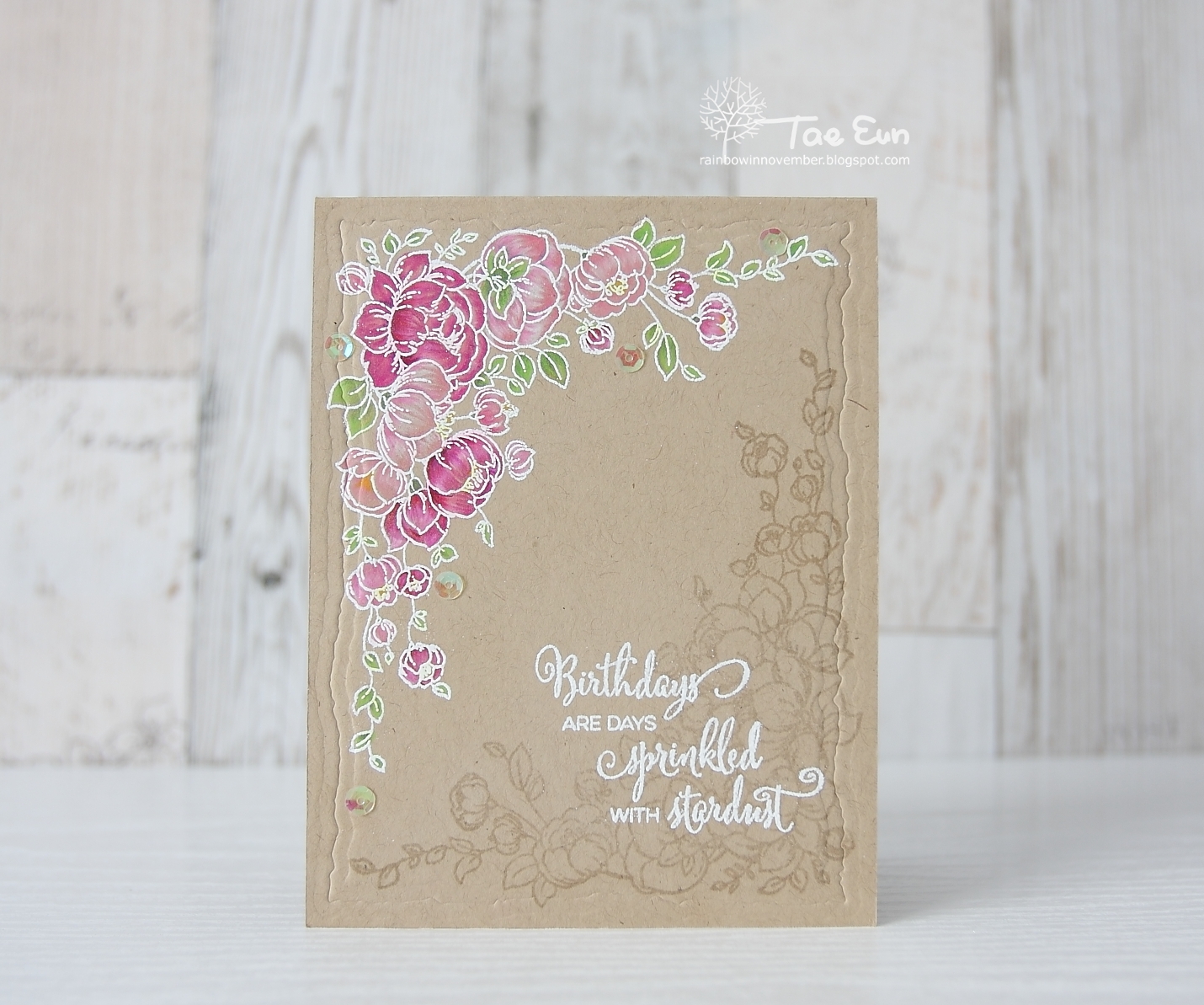 To start off I stamped the floral cluster stamp from Florets set by Penny Black on my kraft card base using an embossing ink. I stamped it twice on two diagonal corners. I then colored one cluster on left top corner using Prismacolor colored pencils. After done with coloring I white heat embossed the image with the help of MISTI. The sentiment is also from Penny Black. I white heat embossed it onto the card. For some more interest I dry embossed a deckle frame using Distressed Edges die from Spellbinders. Some holo clear sequins were my finishing touch.