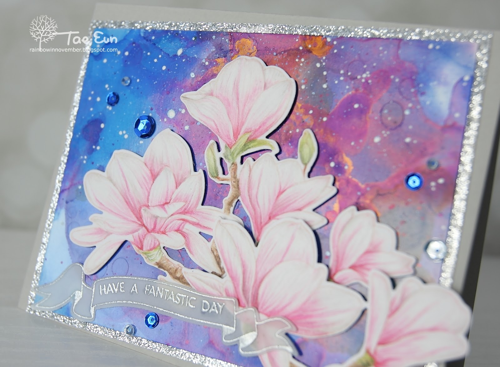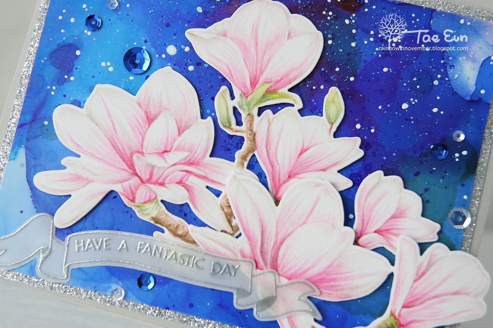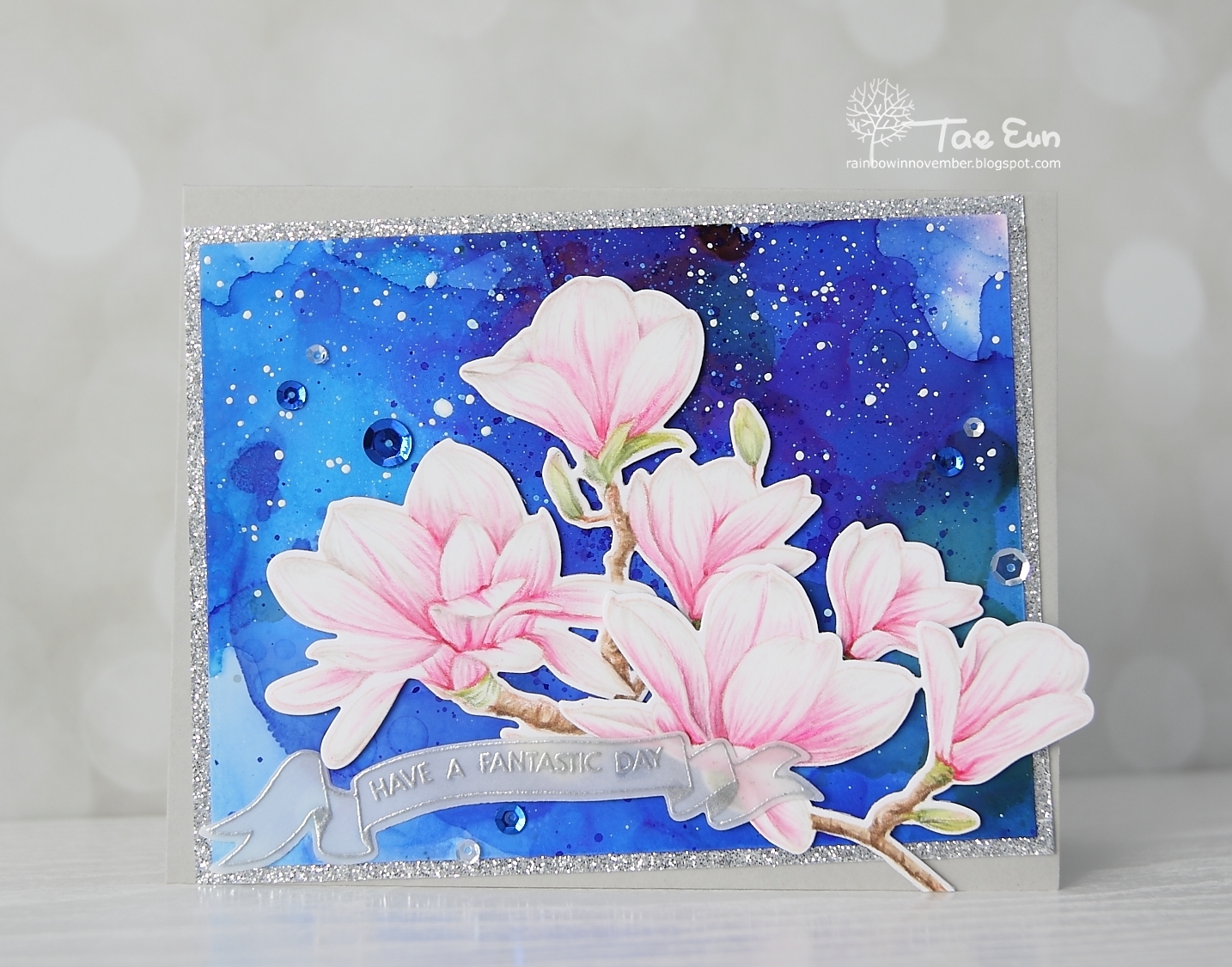 I have stamped the magnolias in Tattered Rose DI on some white cardstock and colored them using Prismacolor pencils. I cut them out using coordinating dies and set them aside. The night blue background was created with Indigo alcohol ink and rubbing alcohol on a alcohol ink cardstock. I added white splatters using Snow cap. After I tried several arrangements of magnolias I decided to use a larger cardbase than A2. The gray cardbase is 6″x 4.75″. As a frame for my alcohol ink panel I add a mat of white panel on the edges of which I adhered Adhesive glitter paper glossy fine silver. I glued the alcohol ink panel flat and slightly tilted on the gray cardbase. I then arranged my magnolias on it. I used foam adhesive to mount the flowers for some dimension.