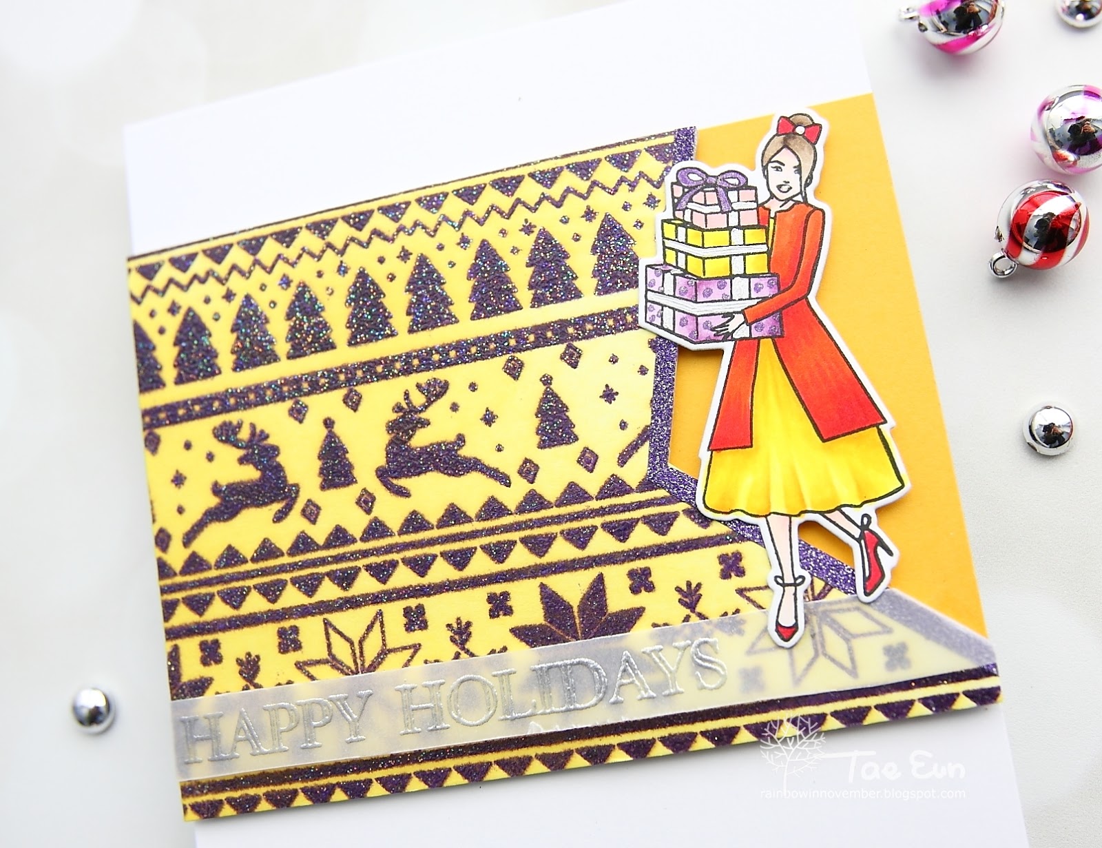 The girl with the present boxes is from City Girls: Winter Edition stamp set also from The Ton. I stamped her in Caviar hybrid ink and colored her using Copic markers. I added some accents using glitter pens, cut the image with the coordinating die and foam mounted it onto the card.