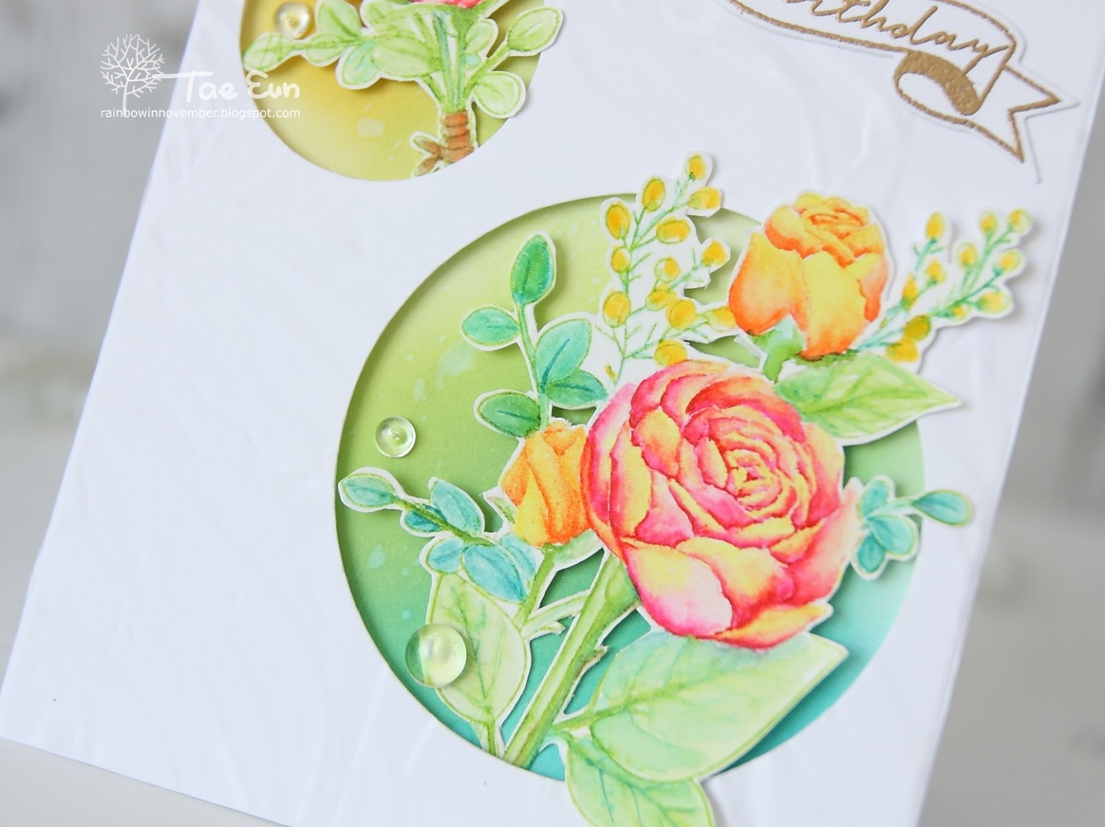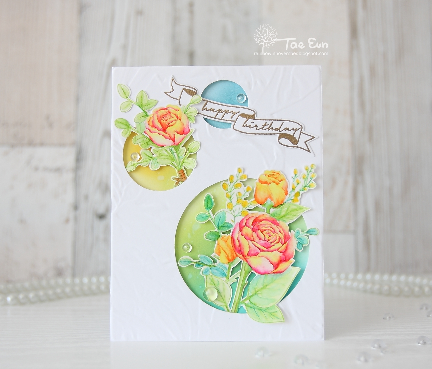 To create the blended background I used Twisted Citron, Peacock Feather, Fossilized Amber and Broken China DOX. The front panel was foam mounted on the cardbase. I then placed the bouquets into the circle windows. The banner is from Thankful Cornucopia set from The Ton and the sentiment is from Penned Sentiments also from The Ton. I gold heat embossed them and cut the banner using coordinating die. After I glued the banner onto the card, I added some clear Dew Drops to finish off the card.