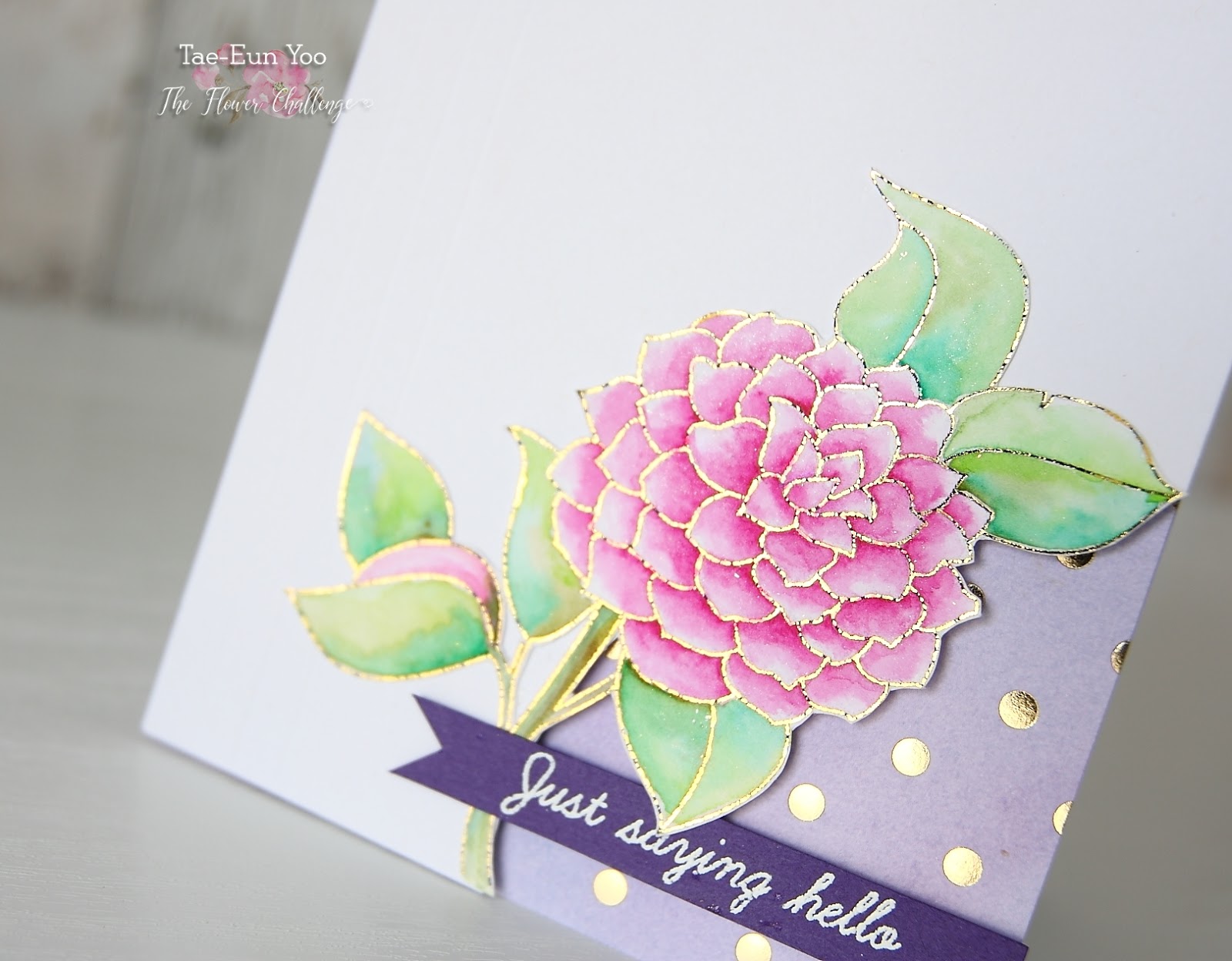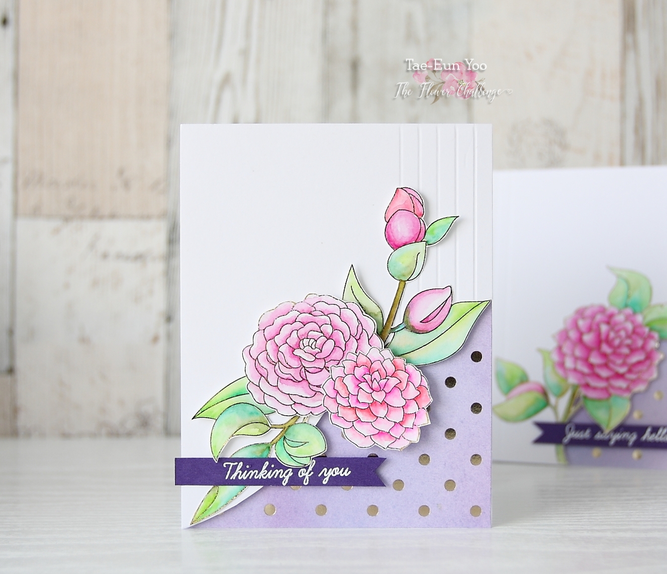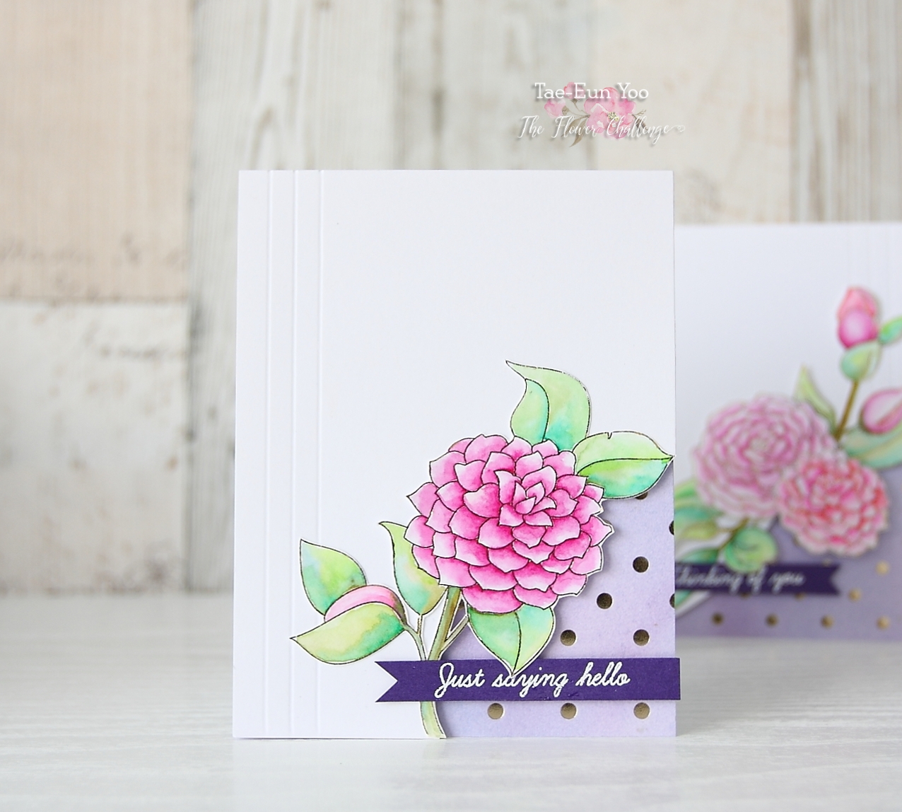 I’m popping in to share two CAS (clean and simple) cards with you! The theme of November at The Flower Challenge is CAS. I’ve made two cards using EunJi’s digital stamp Camelia, which I showed in this post on Monday.