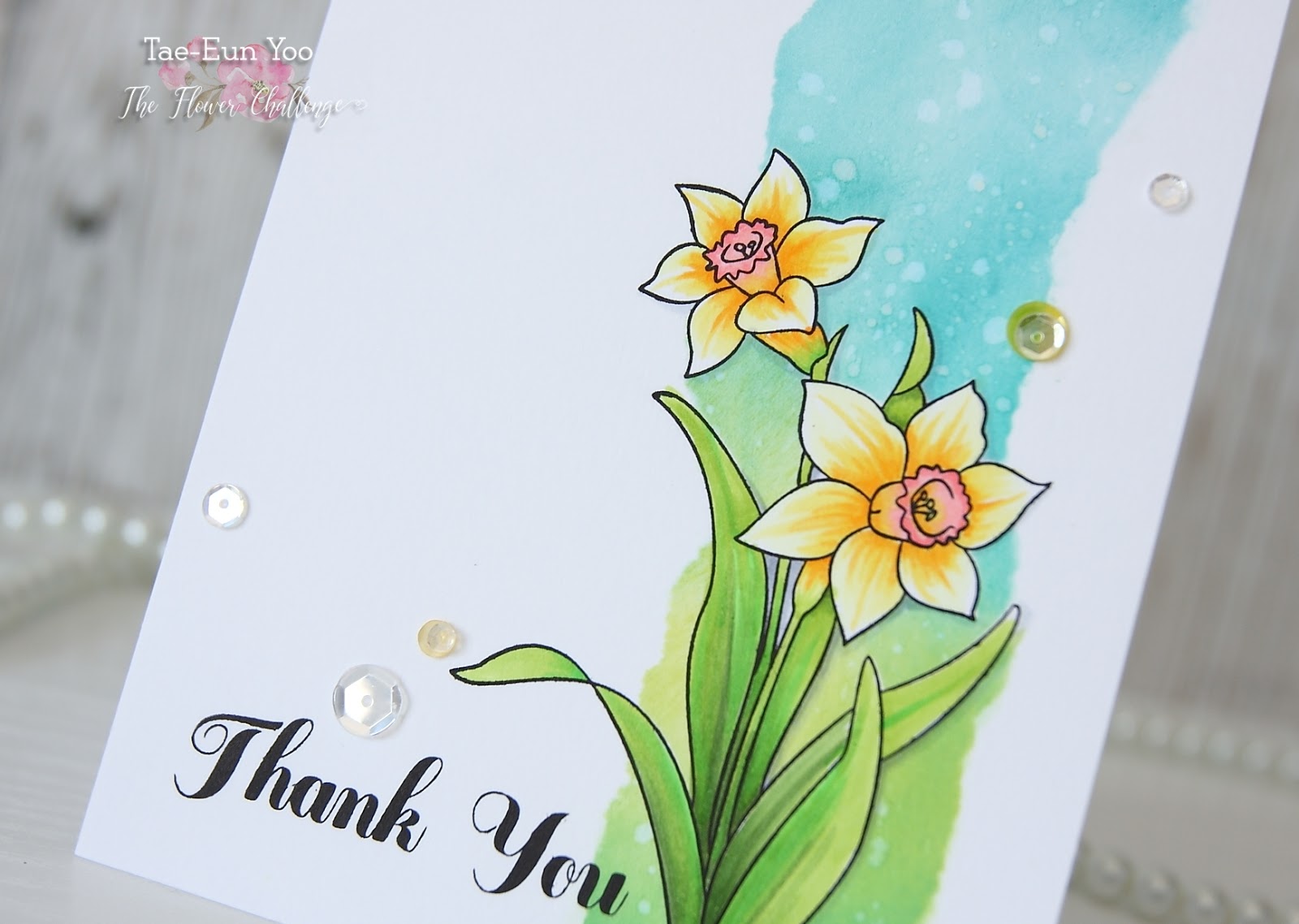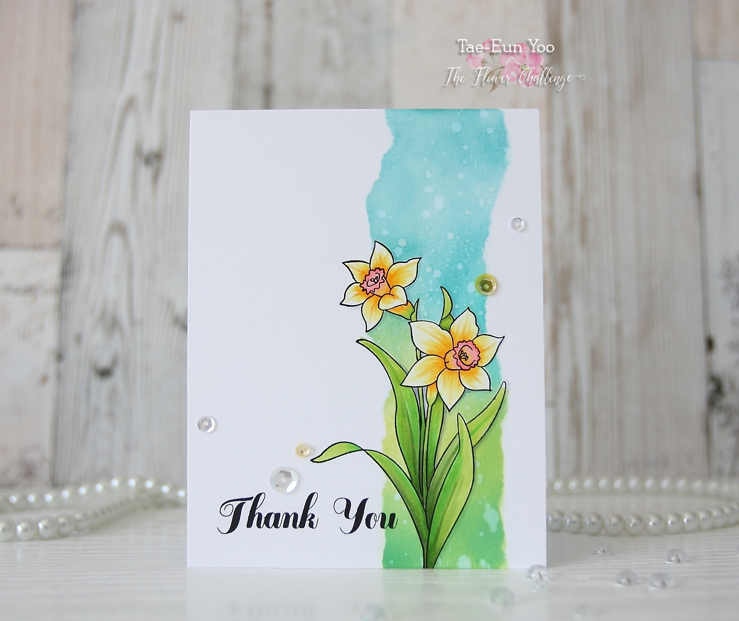 I started by stamping the image in copic-friendly Caviar Hybrid ink. After I masked the image and the sides of the image using torn papers, I blended Twisted Citron, Lucky Clover, Peacock Feather and Broken China DI, splattered clear water and dabbed it off with paper towel. I then colored the daffodil using Copic markers and stamped the sentiment from Tulip Bouquet in Noir. To finish off I added some sequins from Flamenco Sunset, Belle’s Dress and Glass Slippers from The Ton.