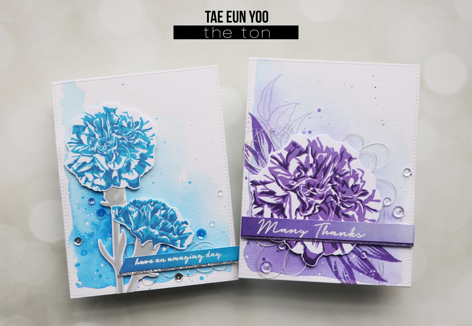 Both cards are in a monochromatic style. I used Fresh Cut Carnations and Large Florals: Carnation set from our Fall 2017 Release as the main flowers and placed them on watercolored background panel in the same color.