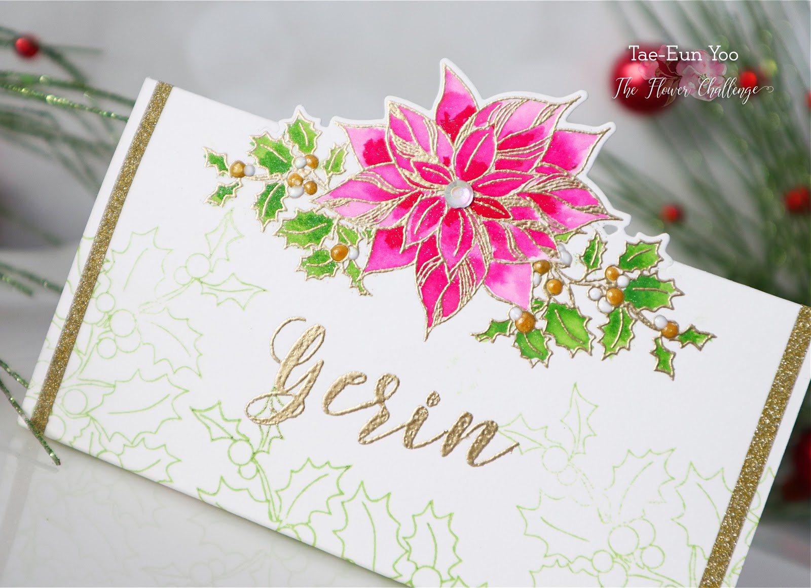 To start off I cut a watercolor paper panel in 6.5″ by 4.75″. I then scored two lines at 0.75″ away from both ends. I marked the middle line on the panel using a pencil and gold heat embossed the poinsettia cluster image from Good Tidings Cluster by The Ton on the middle line of the panel and colored it with Spectrum Noir Sparkle markers. I then die cut the image only the upper part of the middle line of the panel. To add more interest I stamped the outline of Holly Branch (The Ton) in Soft Garden on the panel. I gold heat embossed the name using Scripty Alpha Upper and Lower stamp set. I love this beautiful font!
