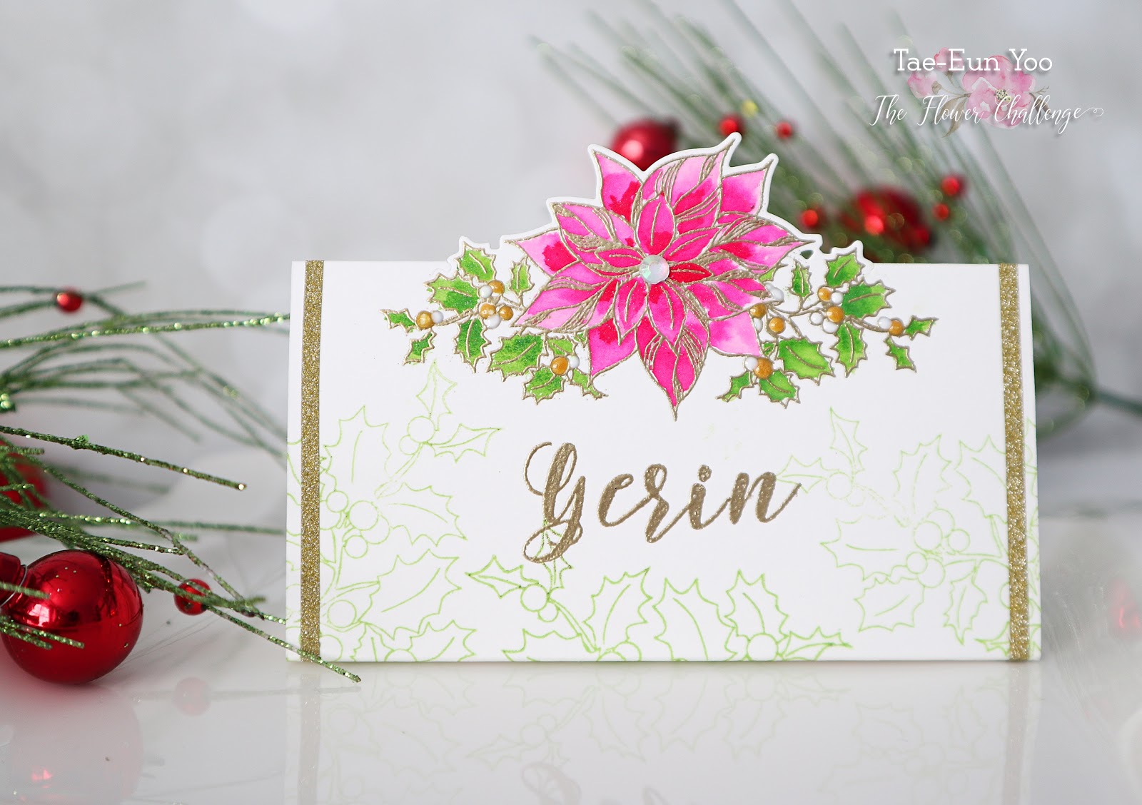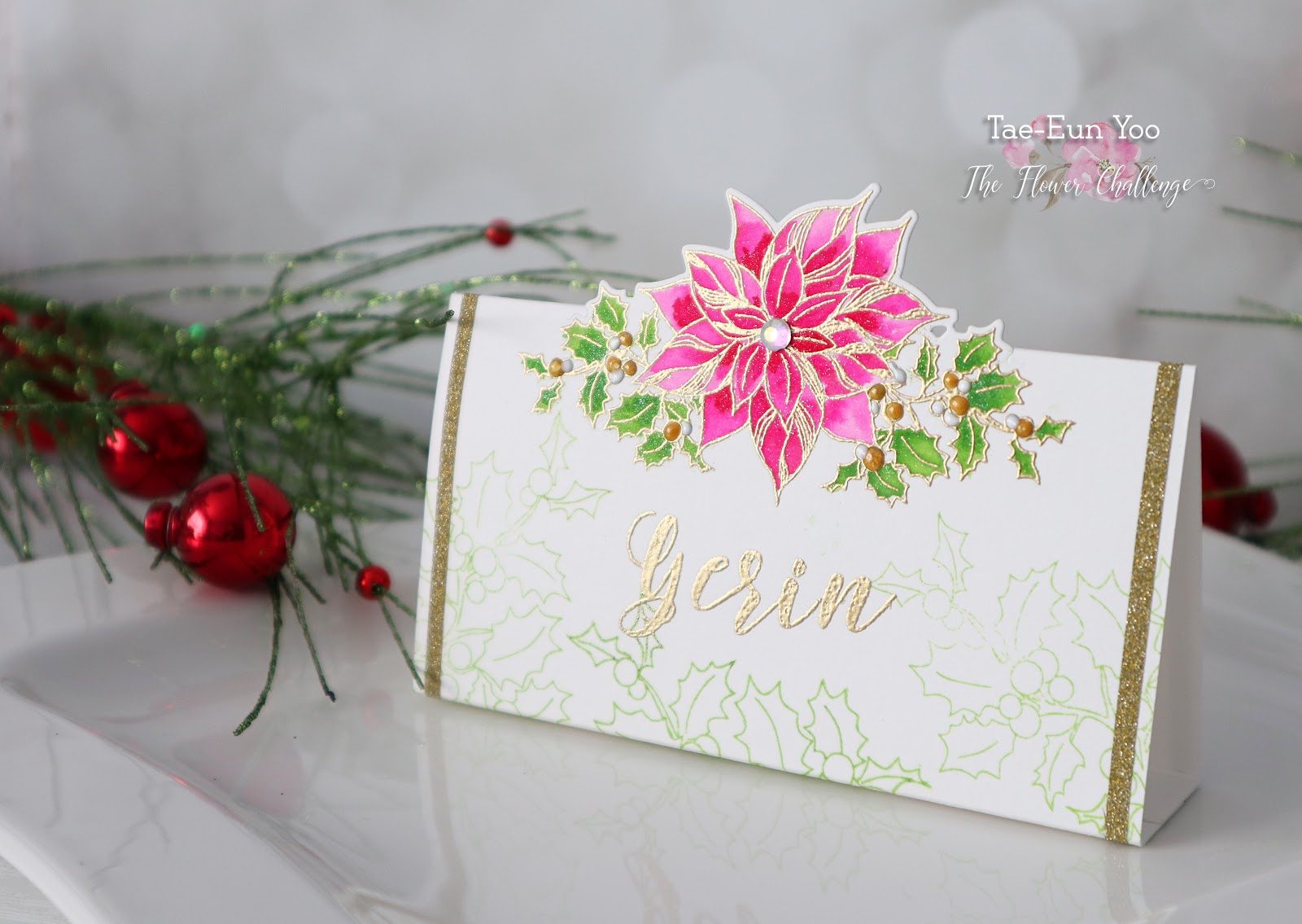 I folded the panel along the score lines and taped the ends together to make the place card stand. For some more sparkle I added thin strip of gold glitter tape on both sides. The 3D berries are made using gold and white Pico Embellisher. I finished off the place card by adding a rhinestone on the center of the poinsettia.