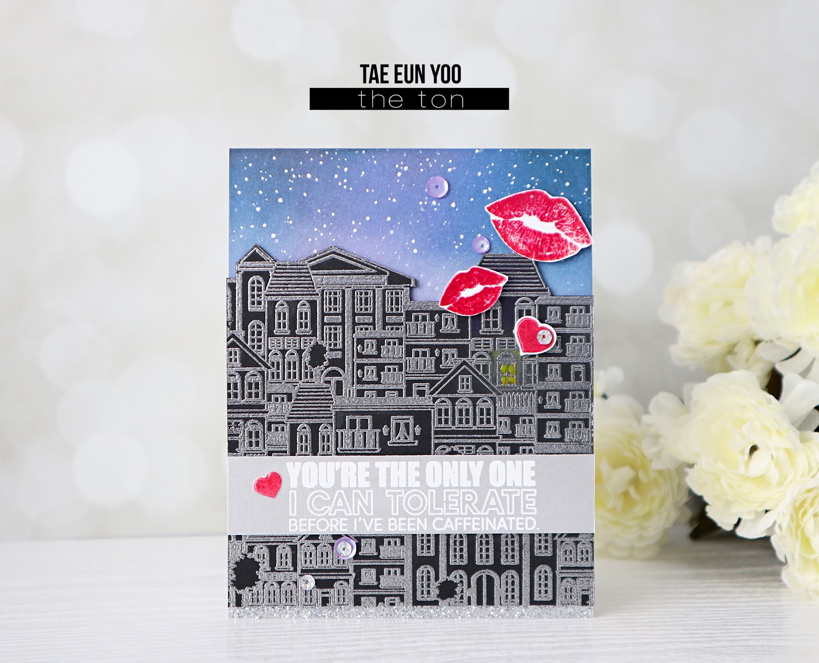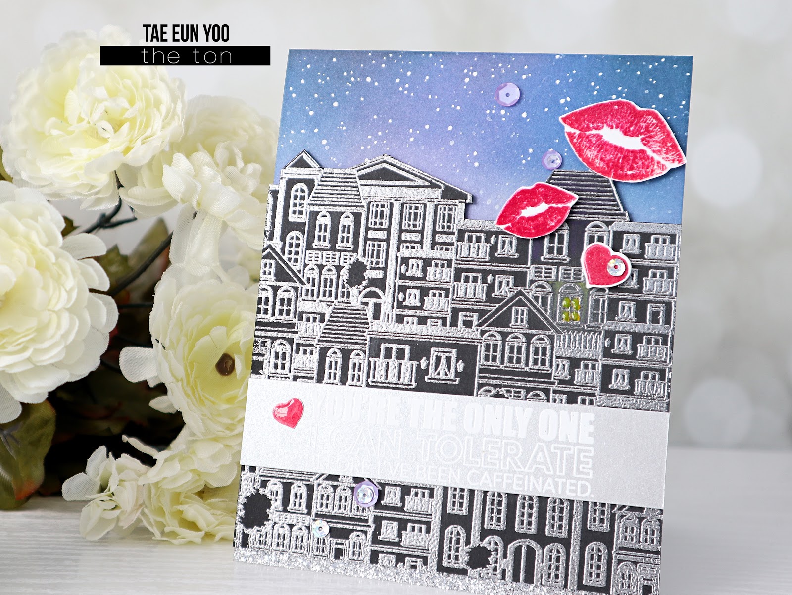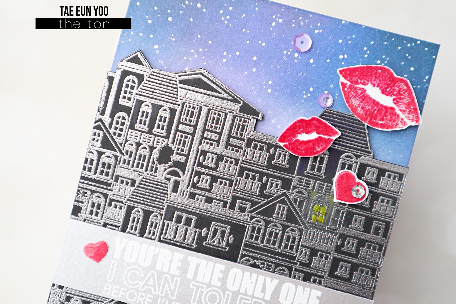 I silver heat embossed the City Buildings background on a black cardstock and cut the upper part to create a skyline. The night sky was created by blending Deep Sapphire, Iris Blooms, Light Onyx on the cardbase. I splattered white opaque ink on it and blended Hampton White pigment ink above the building line. I foam mounted the Ciry Building scene on the cardbase. I trimmed down the bottom part of it to show the silver glitter paper I adhered on the cardbase. I added yellow Pico embellisher on a window of a house I want to show off and colored the house in purple using a colored pencil. The lips from Smooched were stamped in Valentine Red and Lipstick Red and clear heat embossed. The hearts are from Beautiful Day Bicycle set. I stamped them in red as well clear heat embossed and cut with the coordinating dies. The sentiment from Smooched set was white heat embossed on a silver cardstock and added onto the card using foam adhesives. I added the hearts and lips and some sequins from Lilac Blossoms to finish off the card. The small heart on the sentiment panel needed some Glossy Accents :).