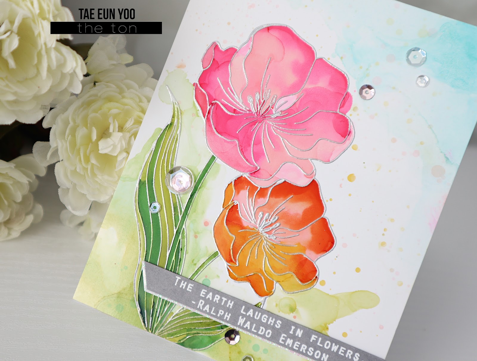 The tulip image from Sweet Folk Hummingbird was silver heat embossed on a alcohol ink cardstock. I then dripped the alcohol ink on it and tilted the paper carefully to move and blend the colors. I used Flamingo and Shell Pink for the pink tulip, Valencia, Sunset Orange and Sunshine yellow for the orange one and Citrus and Botanical for the leaves. The background was created with Aqua and Citrus diluted using rubbing alcohol. The sentiment from the same set was white heat embossed on a dark gray cardstock. I added a strip of white cardstock on which I adhered Glossy Fine Transparent adhesive paper, underneath the sentiment strip to add some sparkle. My finishing touch was some sequins from Pink Bokeh and Cosmic Mauve Couture Mix and Glass Slippers sequins mix.