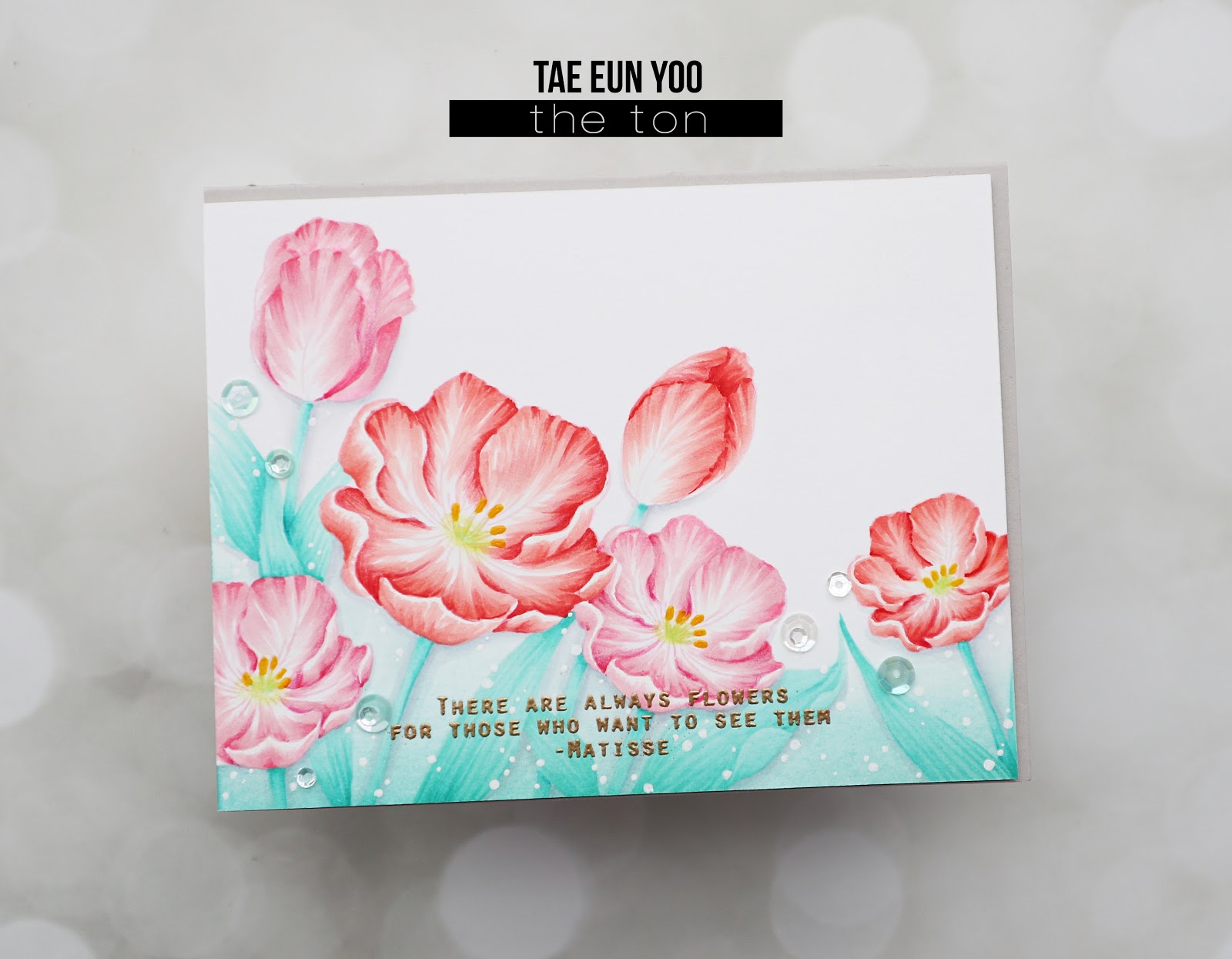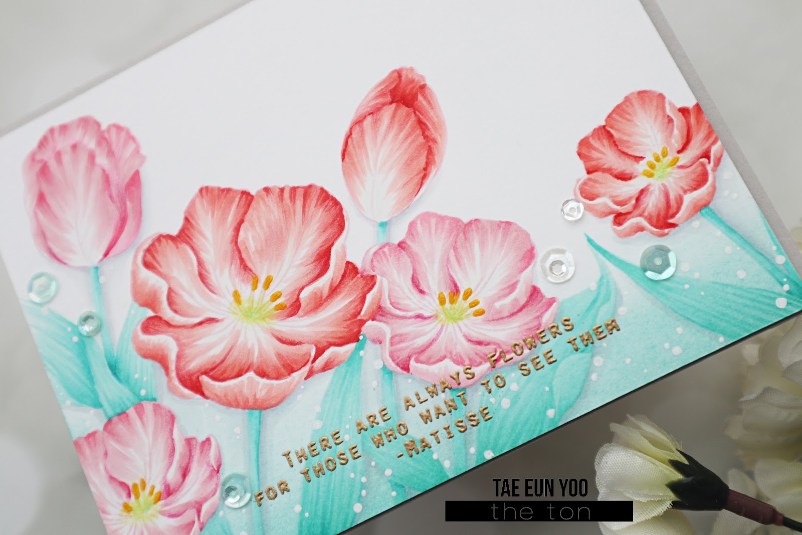 I started off by making masks for the flowers and leaves. I stamped the tulips in Rose Quartz and the leaves in Blue Diamond to create the tulip field along with masking when needed. I then colored the image using Copic markers. I used RV11, RV13, RV14 for the pink tulips, R20, R21, R22 and R24 for the coral tulips and BG11, BG32, BG13, BG15 and BG49 for the leaves. After done with coloring I blended Caribbean Turquoise ink on the bottom part of the panel and added white dots using a white gel pen. The sentiment from Loose Tulips was gold heat embossed on the panel. I trimmed down the panel slightly and foam mounted it onto a light gray cardbase. I finished off the card by adding some sequins from Mint Sugar and Misty Mint.