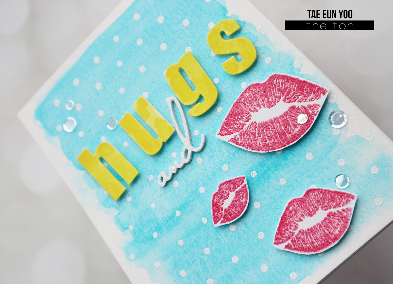 To create this card I made the background panel first. I loosely colored an A2 sized watercolor panel in cobalt turquoise and white heat embossed Delicate Polka Dots on it. I then cut the letters for “hugs” using Bold General Greeting and Bold Amazing Greeting Word Plate Dies from some watercolor paper and watercolored the letters in yellow. I borrowed “and” from Holiday Word Dies. I cut it from a transparent glitter paper made using our Glossy Fine Transparent adhesive paper and two more times from thick white cardstock to stack them together. The lips from Smooched set were stamped in Red Sangria Hybrid ink which is pinkish red. I clear heat embossed the lips after stamping to make them shiny. I foam mounted all the elements onto my card as shown in the picture and added some sequins from Glass Slippers round confetti.